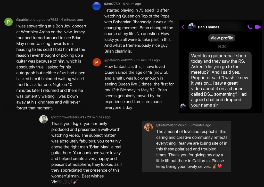 The highlight of the year was when Brian May attended our enthusiast meet-up in Berkshire, U.K. My coverage of this part of the event produced my best performing YouTube video which has attracted over 180,000 views, 2,800 likes and hundreds of positive, supportive comments at the time of writing. Read a small selection of these in the screen captures below.