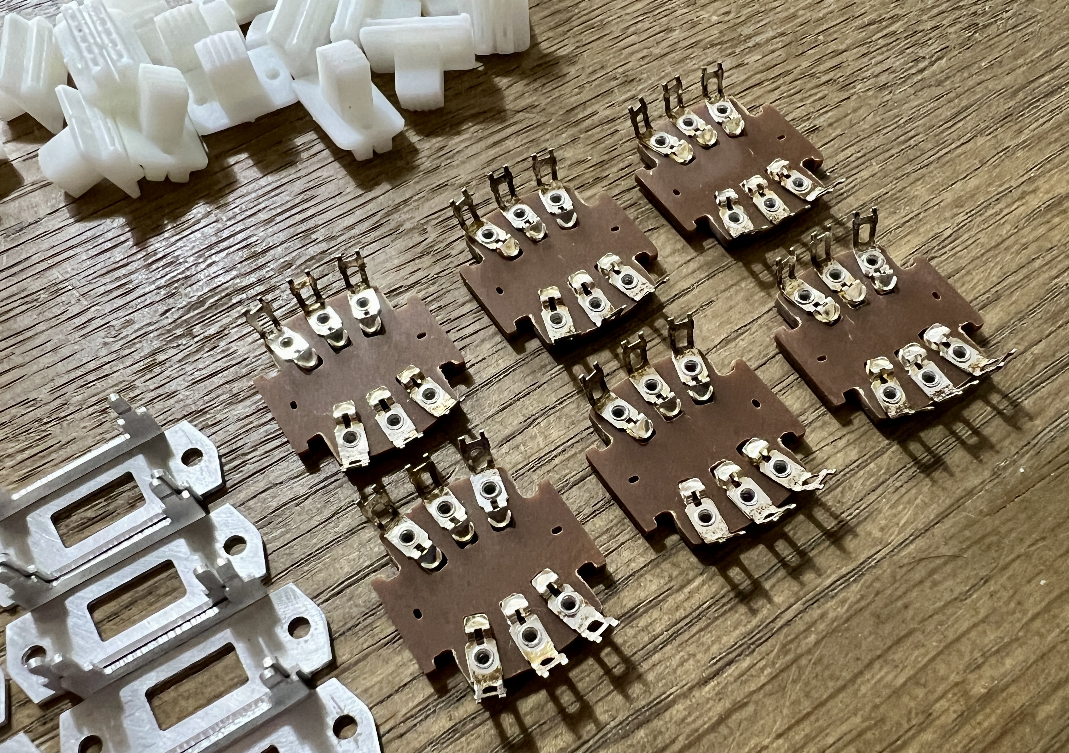 Around this time, Andy Guyton of Guyton Guitars was developing his next project: a production run of twenty ultimate Brian May Red Special replicas based on the two 1970s and 1985 era reliced props he made for the Bohemian Rhapsody movie. Andy contacted Tim to request a batch of 120 switches. For maximum authenticity, he got his own metal chassis cut from steel sheet as per the original items. I cut a batch of 180 wafers using my Stepcraft 2/840 CNC machine in my garage to cover this order and give Tim some spares to sell and experiment with.