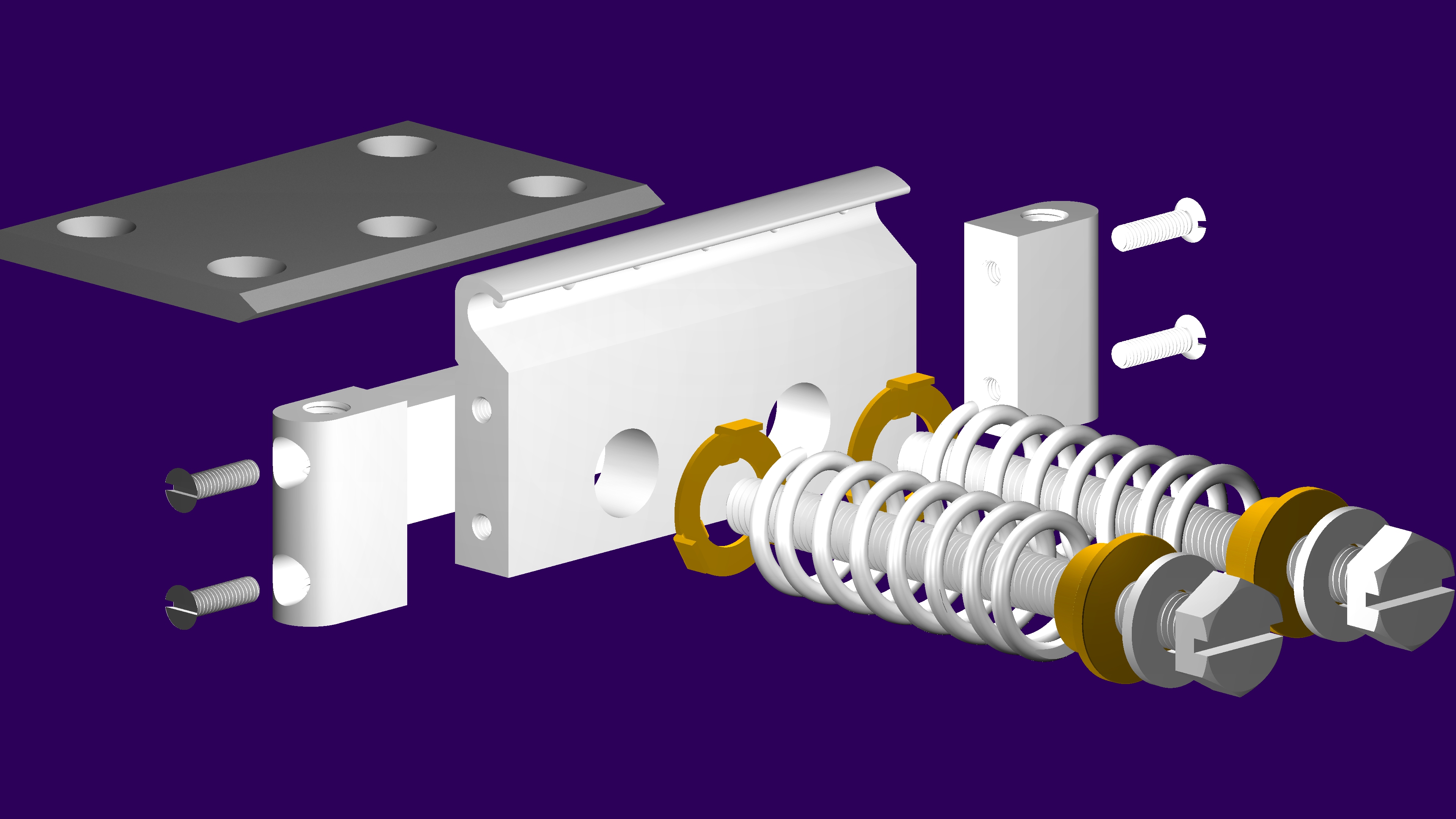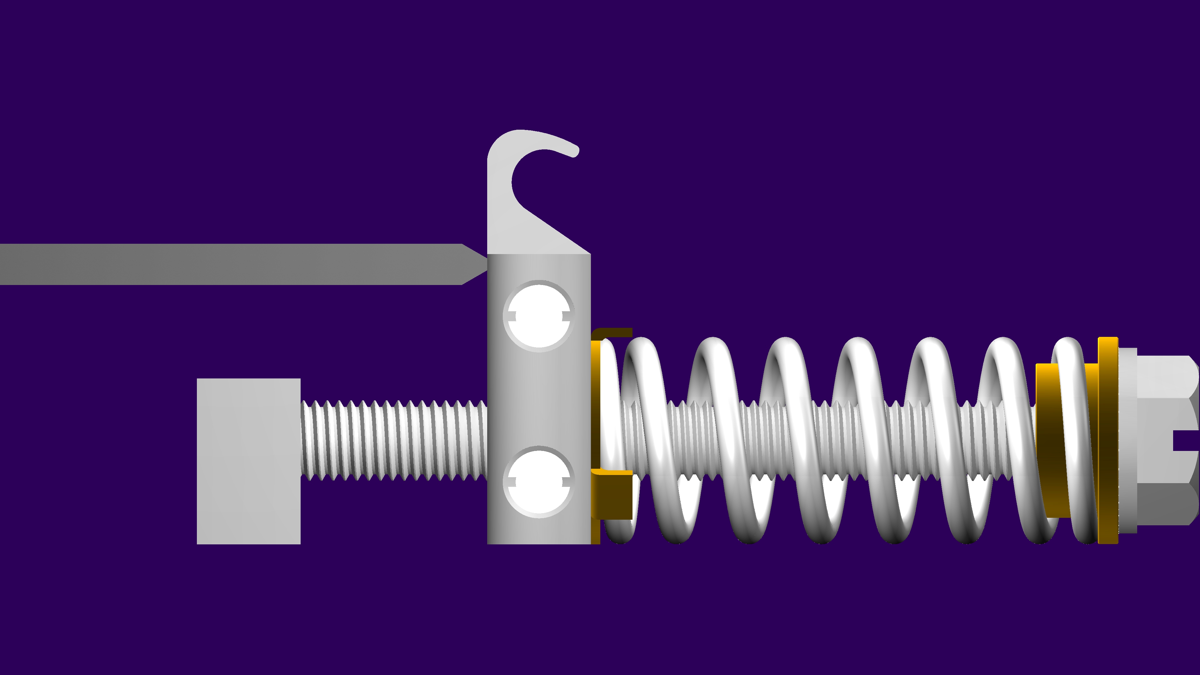 Renders from my CAD design interpretation of the original assembly are included in the gallery below. Note that the pass through holes are 3/8″ in my design (and Greg Fryer’s design for his three replica guitars) but are likely 7/16″ (11.1 mm) to 1/2″ (12.7 mm) on the original item noting that the Panther valve spring innner diameter is around 11.5 mm. 3/8″ is likely the minimum diameter required to accommodate the range of vertical pivoting movement and I can only use twist drills up to 10 mm diameter in the chuck of my mini drill press.