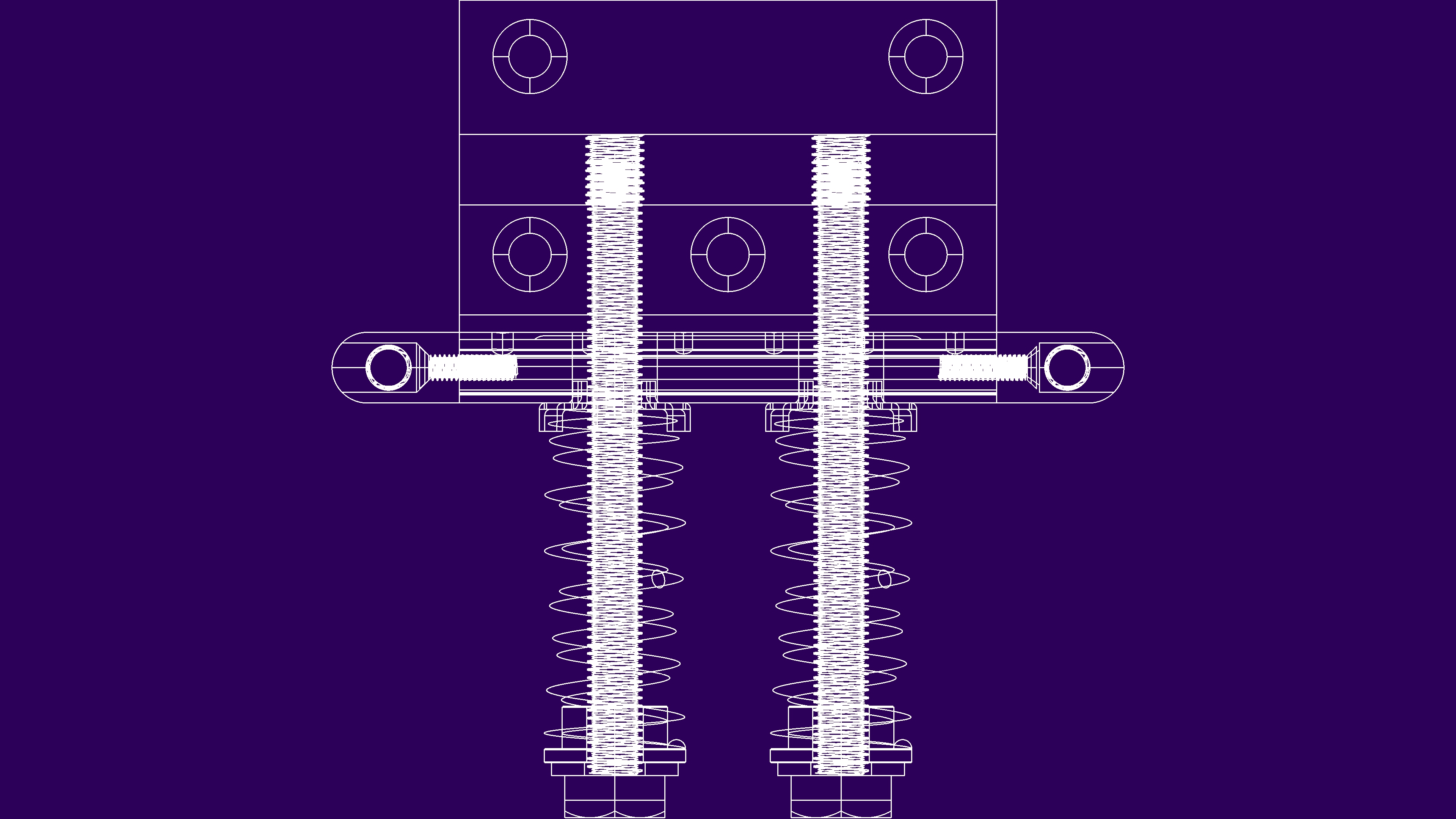 String tension is counteracted by the compression force of two valve springs from a 1928 Panther motorcycle which butt against the rocker block and are located in the pass through holes by fasteners fashioned from brass plate. The moving components are held in position with two 1/4″ UNF thread hexagonal head set screws which are anchored into a section of 5/16″ thick x 1/2″ high steel bar located between the upper and lower guitar body sections. Slots are milled into the set screws heads to allow spring tension to be adjusted by inserting a flat blade screwdriver through holes in the back of the guitar body.