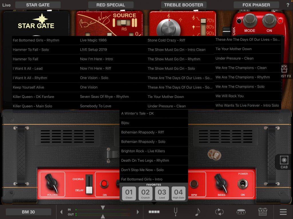 The software has numerous factory presets which allow the user to simply select a Queen track or live tone from a list and instantly dial in the settings to the effects chain. These are illustrated in the image gallery and include Hammer to Fall, Keep Yourself Alive, I Want it All, The Show Must Go On, These Are The Days Of Our Lives “Live Magic 86” or “live setup 2019”.