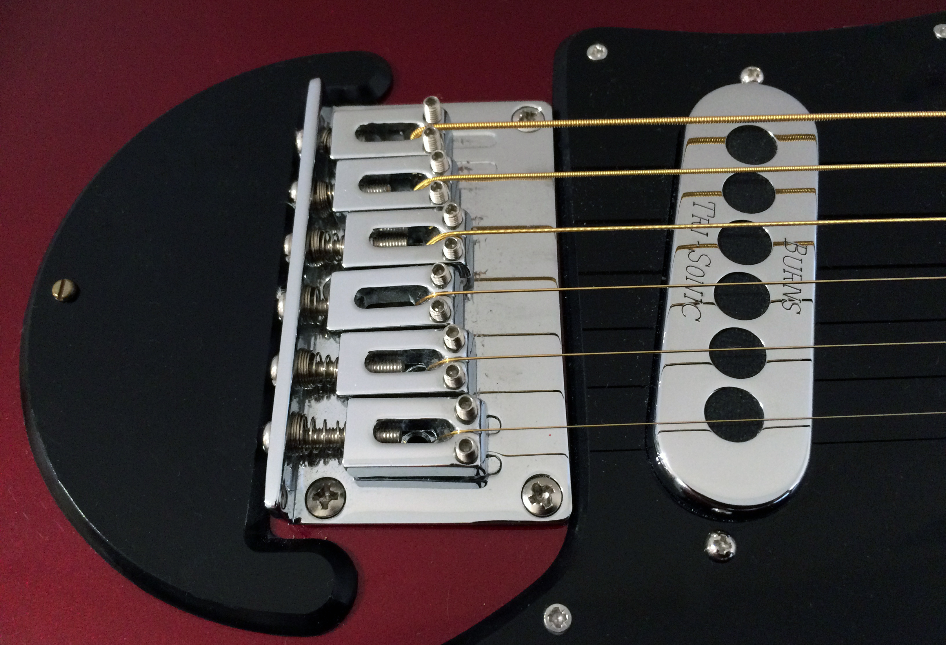 On 30th June 2012 I bought a BMG Mini May from Guitar Guitar for £163.95. I knew very little about 3/4 scale guitars in general or this one in particular. I also bought a Vox Valvetronic VT20+ practive amplifier with the naive objective that this would be a fun outfit for me to get Brian May Red Special tones at home and as an introduction to guitars for my young son. However, I could not get the guitar tuned to open E so I took it to Bob at Guitar Guitar in Edinburgh for a set-up which cost an additional £65.99. Bob had to ream three bridge saddles to alleviate the acute string bend angle. He fitted a set of 0.013 gauge strings to allow higher tension tunings. Even then, he could only tune it to open F, one semitone higher than normal tuning. He also reported that the bridge was set too far forward by approximately 5 mm by design which required the lower string bridge pieces to be at or near their limit and the lowest individual bridge length adjusting screws to be shortened.