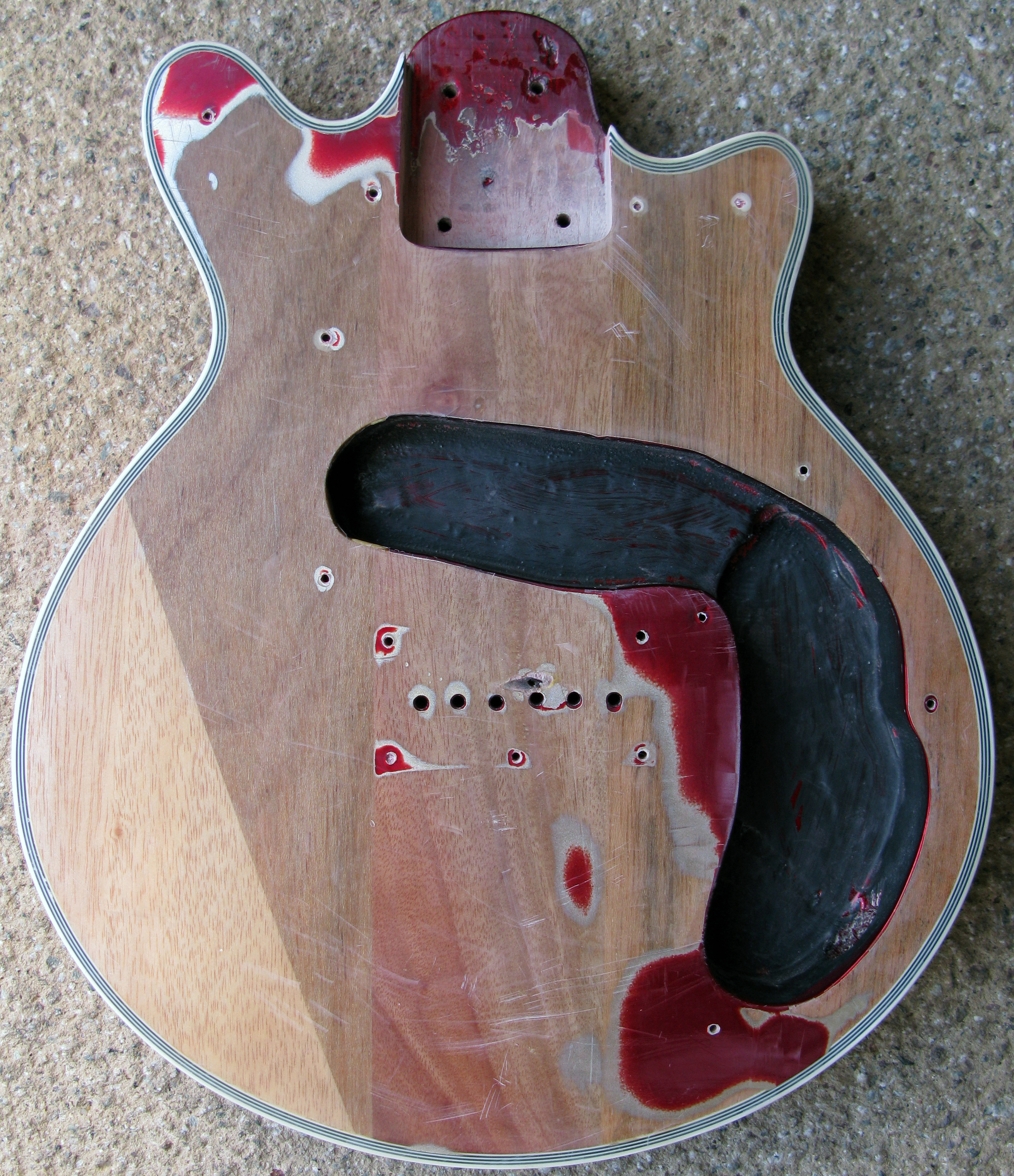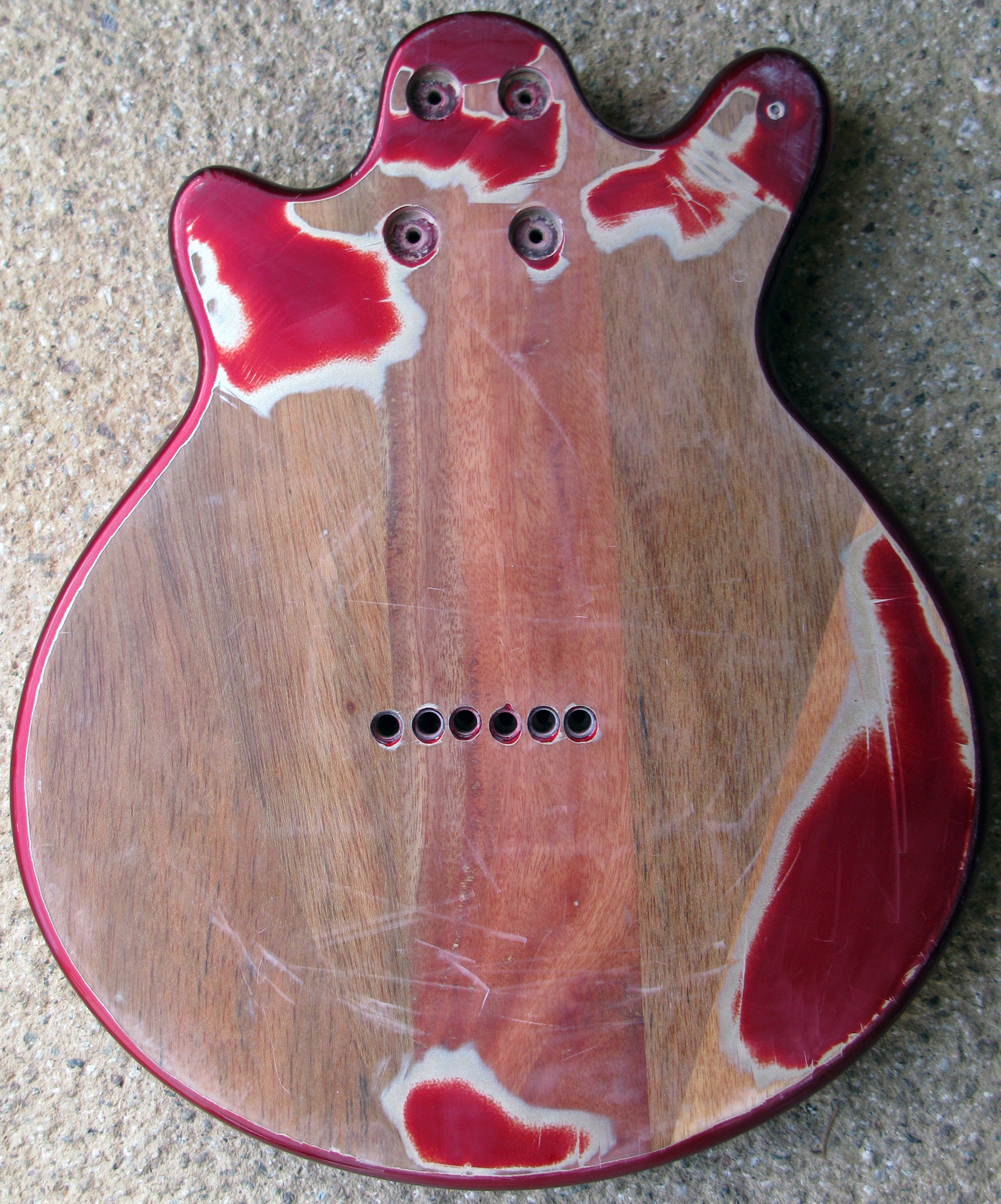 - Stripping the original finish, staining and lacquering red/brown as per the original guitar and re-coating with lacquer.