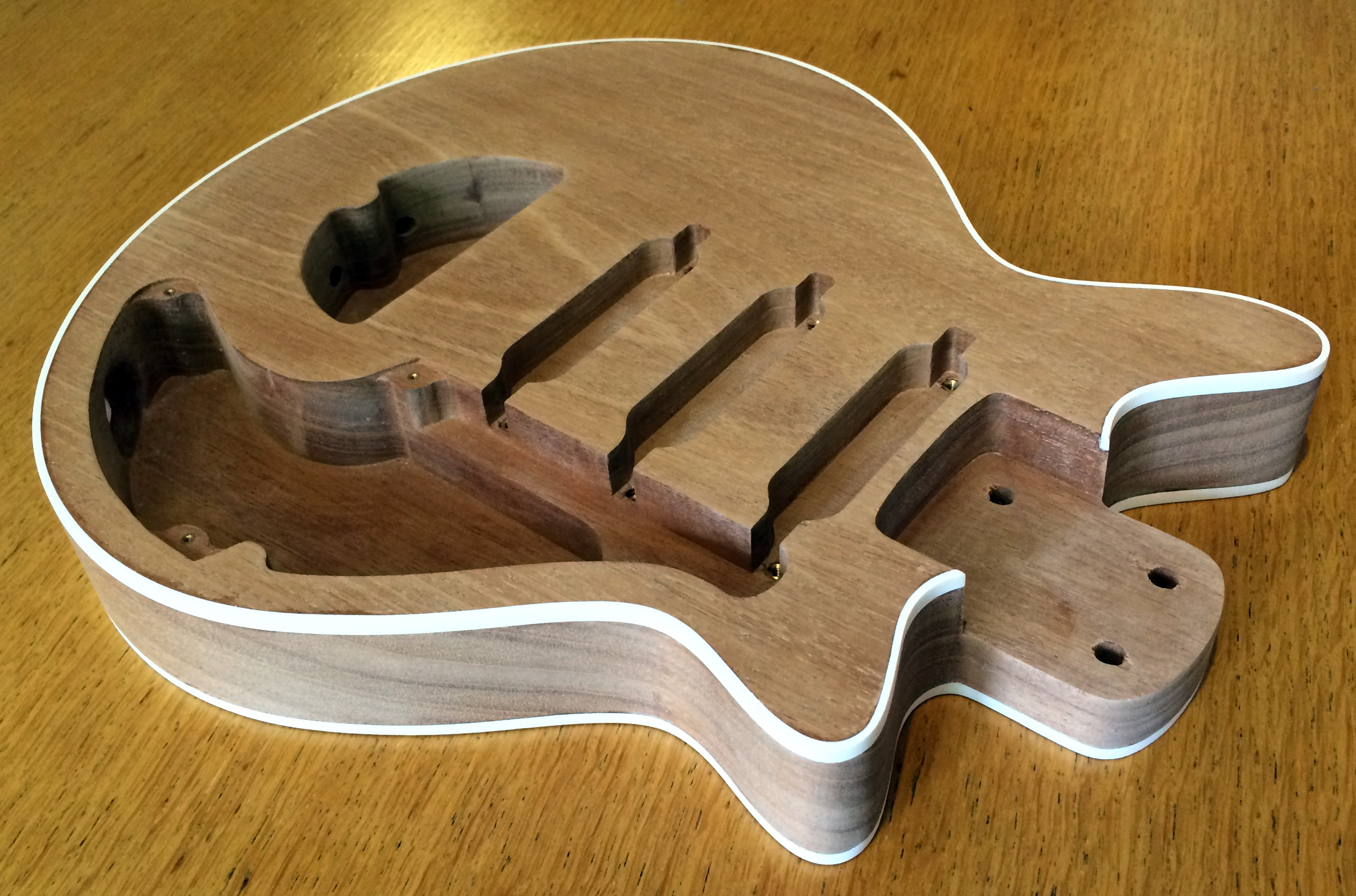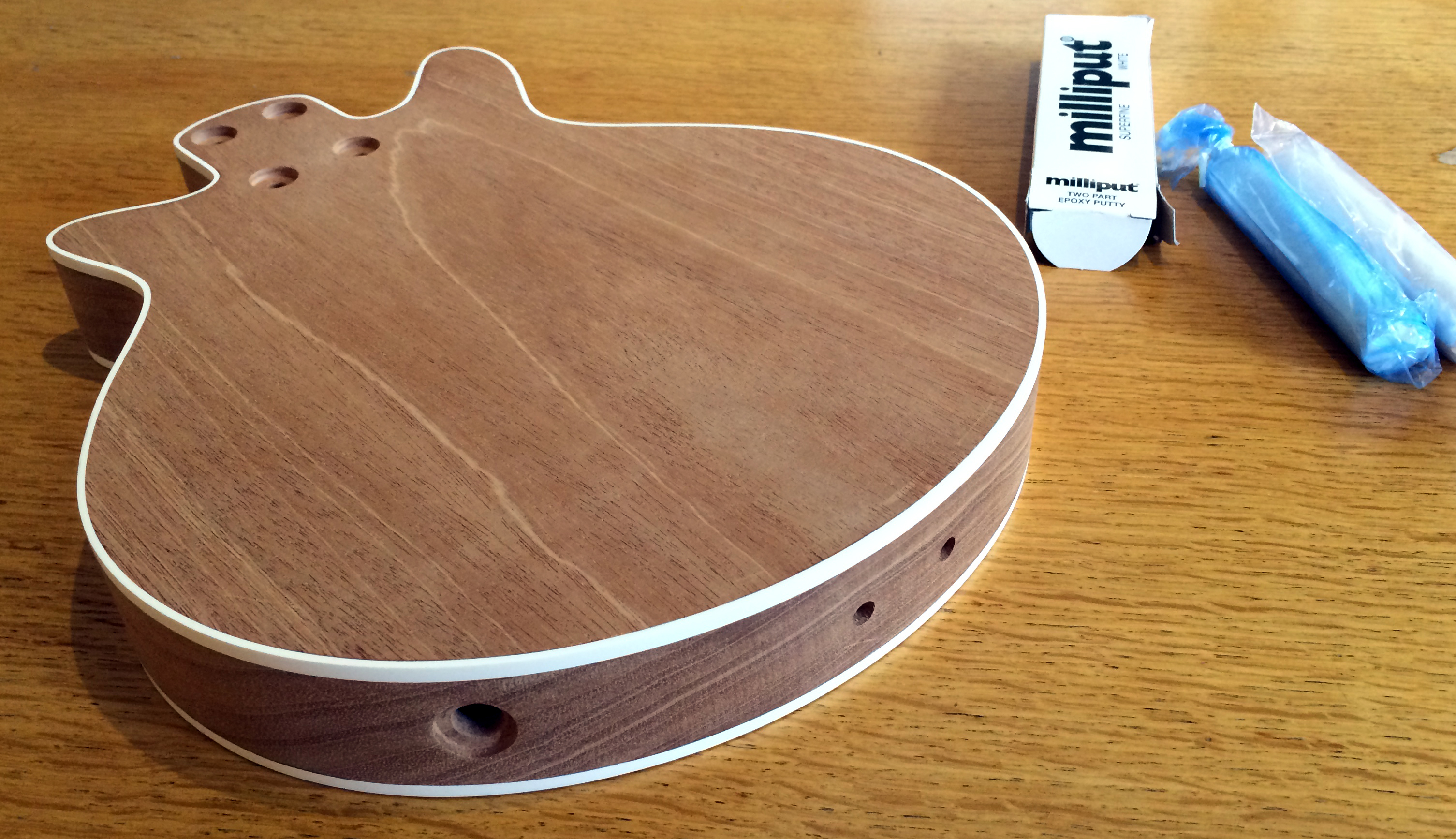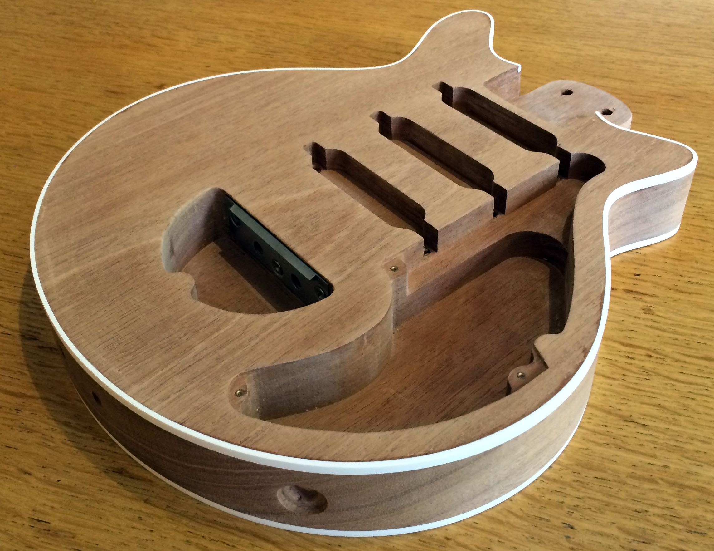 Binding the body was a particularly challenging task due to the tight radii on this 3/4 scale Brian May Red Special shape. The original BMG Mini May only has edge binding on the upper face edge. I used a Makita RT0700CX4 handheld laminate trimmer/router with the appropriate StewMac bearing guided router bit. I pre-shaped the white plastic binding by heating it with a heat gun and bending into into the rebate. I glued it on with a standard cyanoacrylate superglue and filled any voids with pure white Milliput brand epoxy putty. I describe and illustrate this process in more detail in the analogous article in my later full size Brian May Red Special replica build project here: