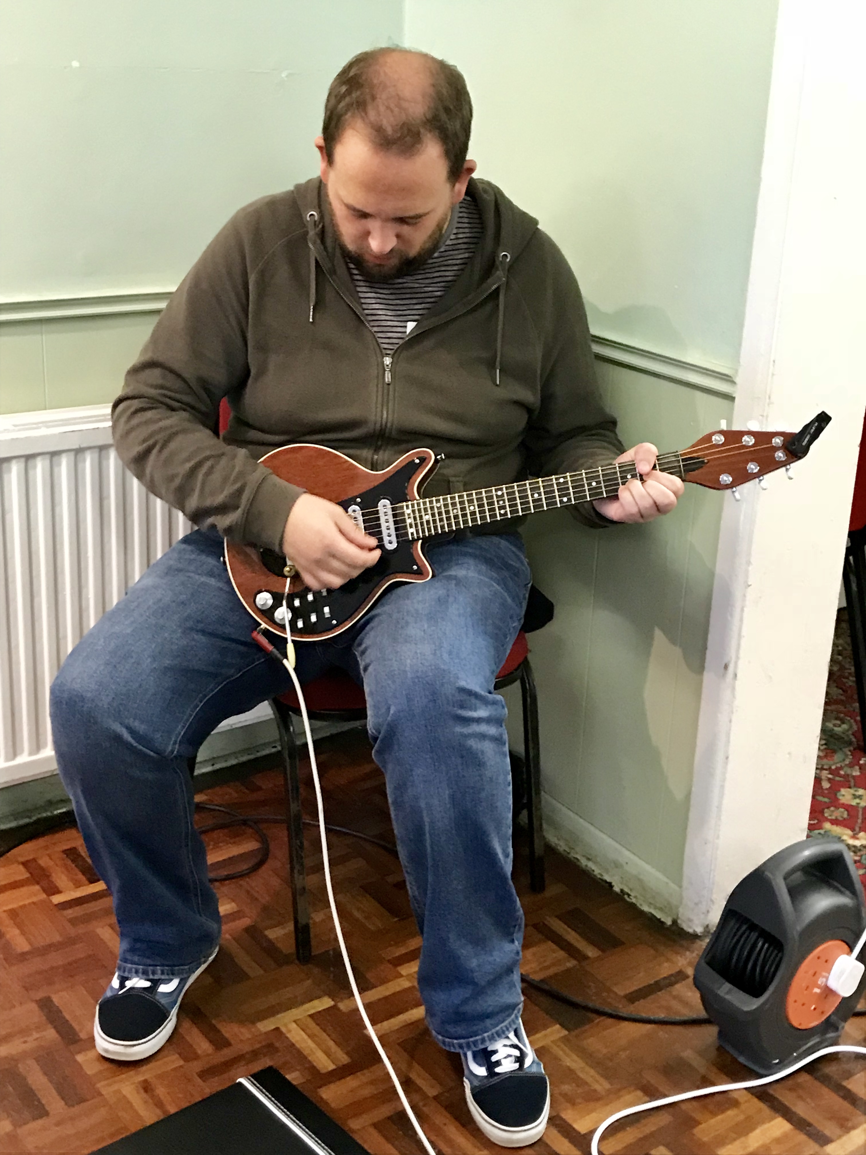 Dan Thomas and Matt Hutchison were the only people brave enough to play it through a full fat Vox AC30 with a Fryer treble booster and be filmed! A couple of minutes of Dan’s effort are included in the embedded video below. Please bear in mind the following points when listening: