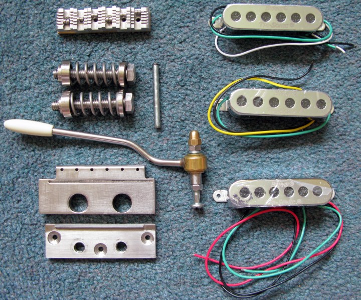 For this project, the hardware (tremolo arm and tailpiece, conversion style fulcrum plate, bolts and spring cups, roller bridge and custom aluminium control knobs) came from César Beltran in Lima, Peru and the set of Burns Mini Tri-Sonic pickups from Barry Gibson at Burns London. These units are designed as drop-in replacements for Stratocaster single coil pickups and are also fitted to the Burns Cobra guitar as standard. They are still available at the time of writing for a reasonable £135. See the accessories section of the Burns London website: