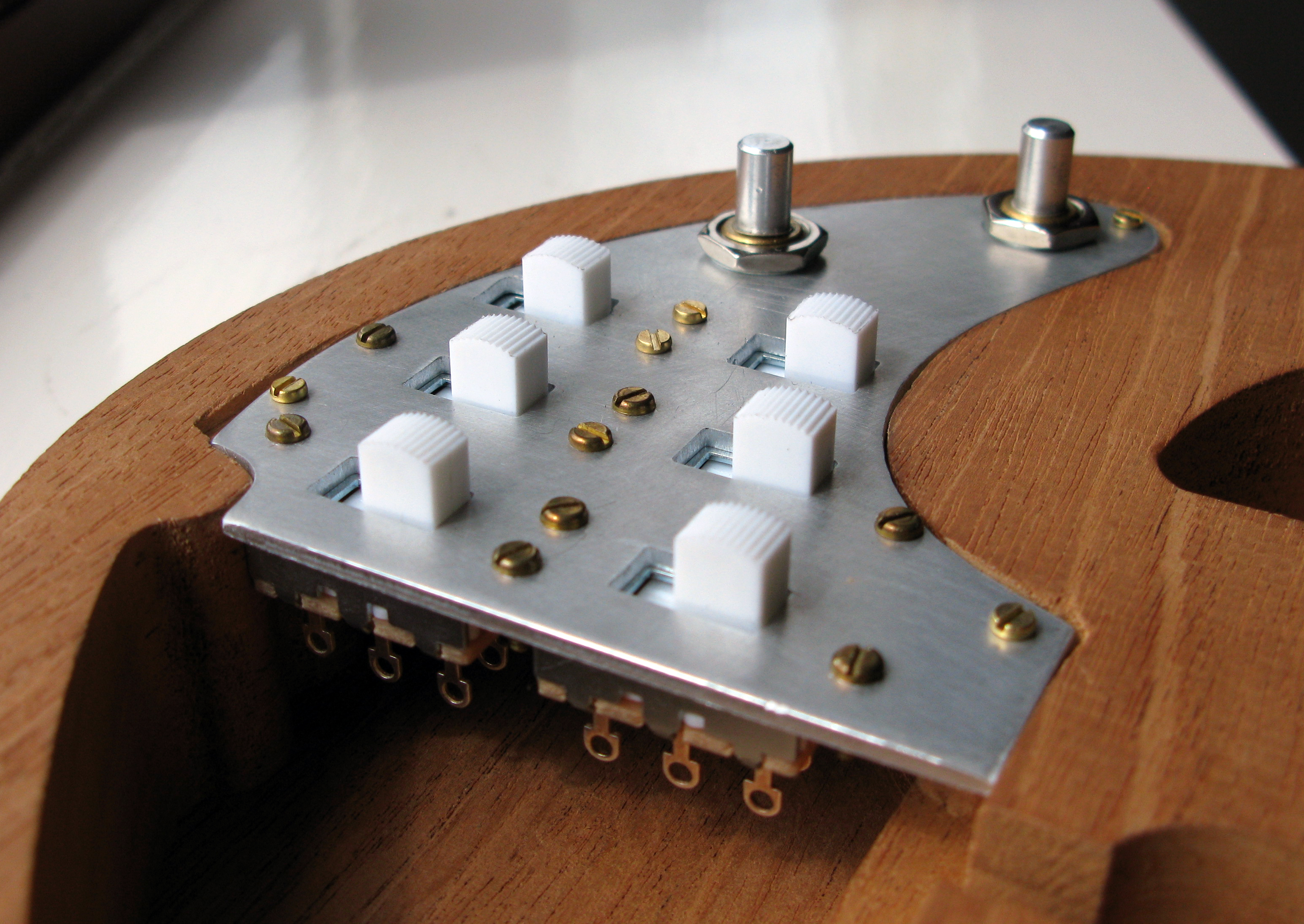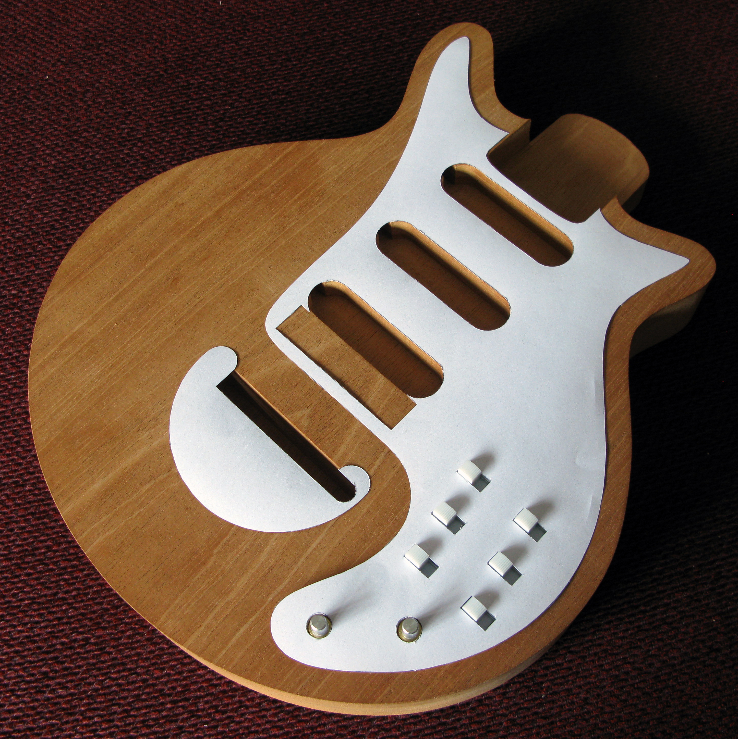 I made the KZ Super Brian May Red Special replica style control plate from 2 mm thick aluminium plate by the following method:
