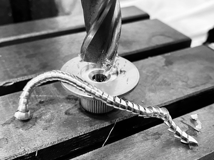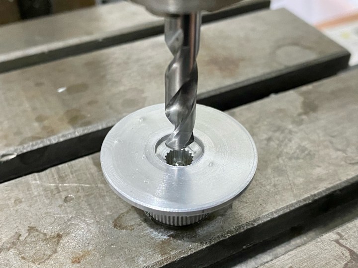 - Centralised the chuck in the shaft hole by eye using a 5.5 mm solid carbide jobber drill.