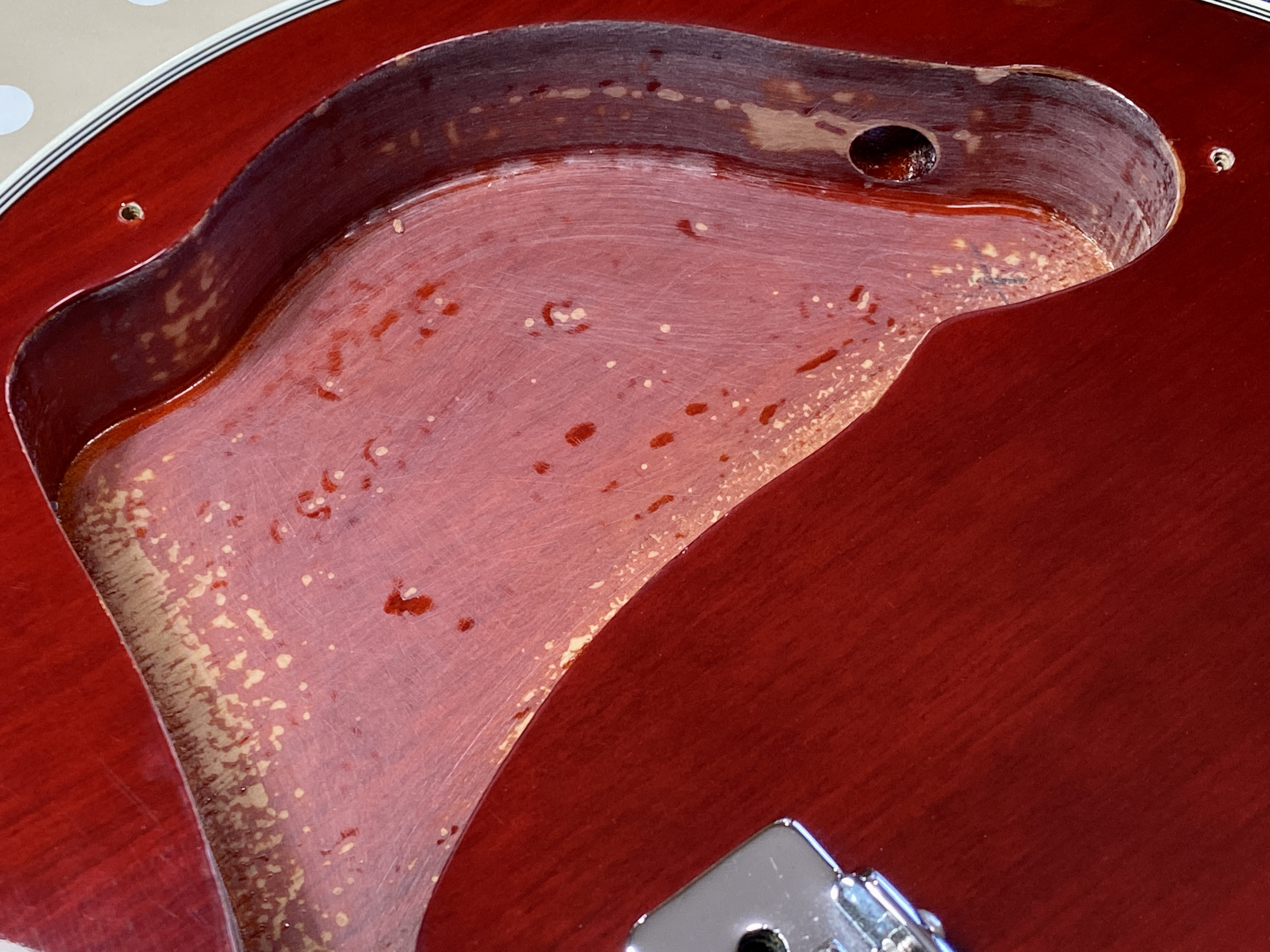 I glued these sections into the guitar using Evo-Stik Time Bond contact adhesive on the floor and Evo-Stik Serious Glue for the sides. This is not contact adhesive and allows repositioning for two to three minutes. I removed the 1/4″ jack socket to facilitate insertion of the cut sheet. These images illustrate the construction of commercial Brian May Red Special guitars which consist of a routed body and a thick lid. This is the most cost-effective manufacturing method for a chambered electric guitar like the Brian May Red Special and is one I would like to explore in a future build project.