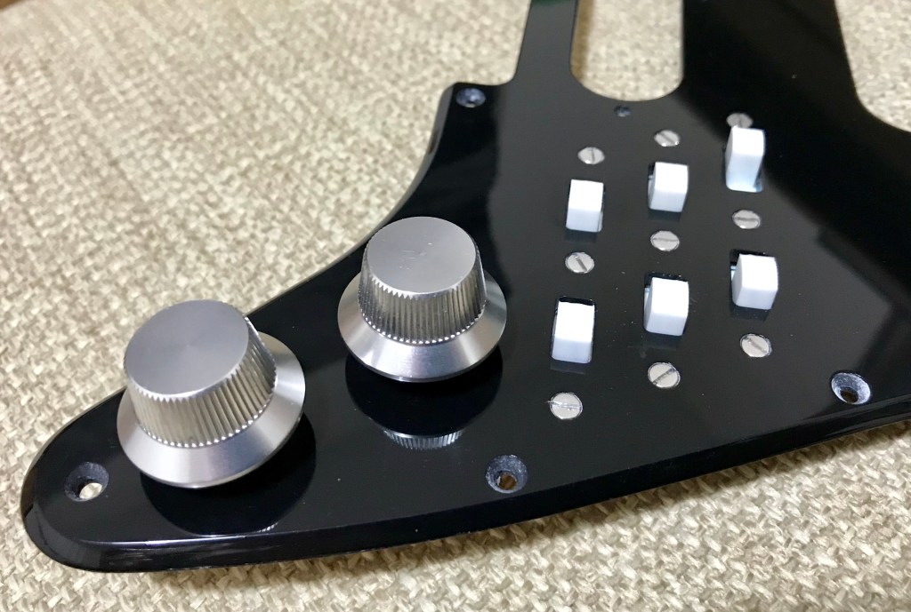 These look great in their own right, particularly the bare aluminium finish which is reminiscent of Brian May’s Red Special while the top hat shape is pure Fender. The only snag is that the centre shaft diameter is around 5.8 mm whereas the Bourns plain shaft potentiometers are 6 mm diameter. I drilled these out to make them fit using the method I described in detail in the routing and milling operations section of my Burns RS conversion project: https://dsgb.net/projects/burns/routing/