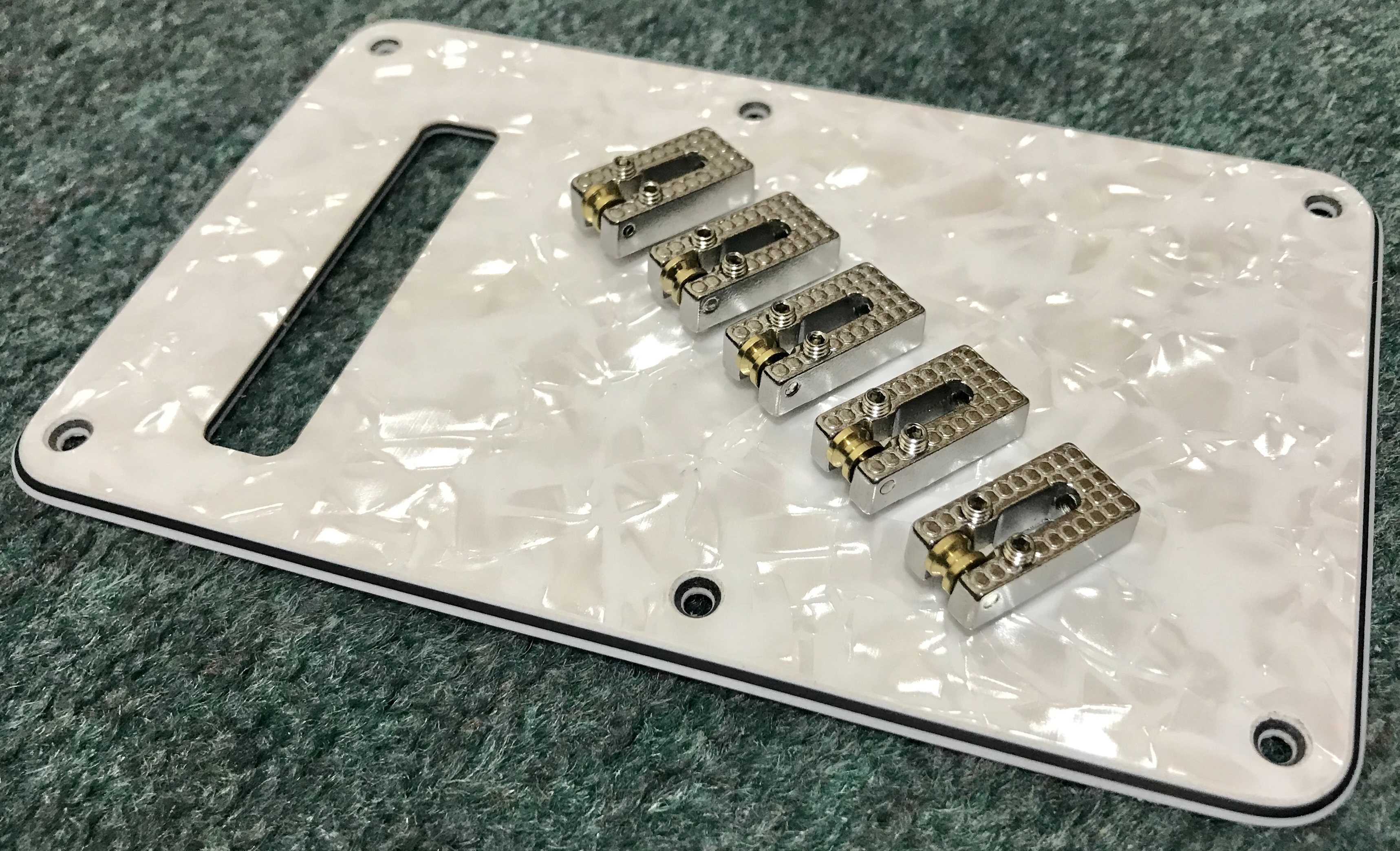 Roller bridge saddles like the ones pictured are available from various eBay sellers based in China. They have a brass captive roller in a solid saddle. I ordered a set which took 15 days to arrive. The roller saddle itself is quite satisfactory but all the hardware [correct specifications are: M3 x 15 intonation adjustment screws, 6-8 mm long springs and M3 x 6 or M3 x 8 mm action height grub screws] were all too long requiring replacements had to be ordered; this was reasonable since they only cost £6.99 including postage. I traded all the hardware on the instrument for the Adeson Tri-Sonic pickups so I wasn’t able to re-fit the intonation springs and new Fender items had to be ordered.
