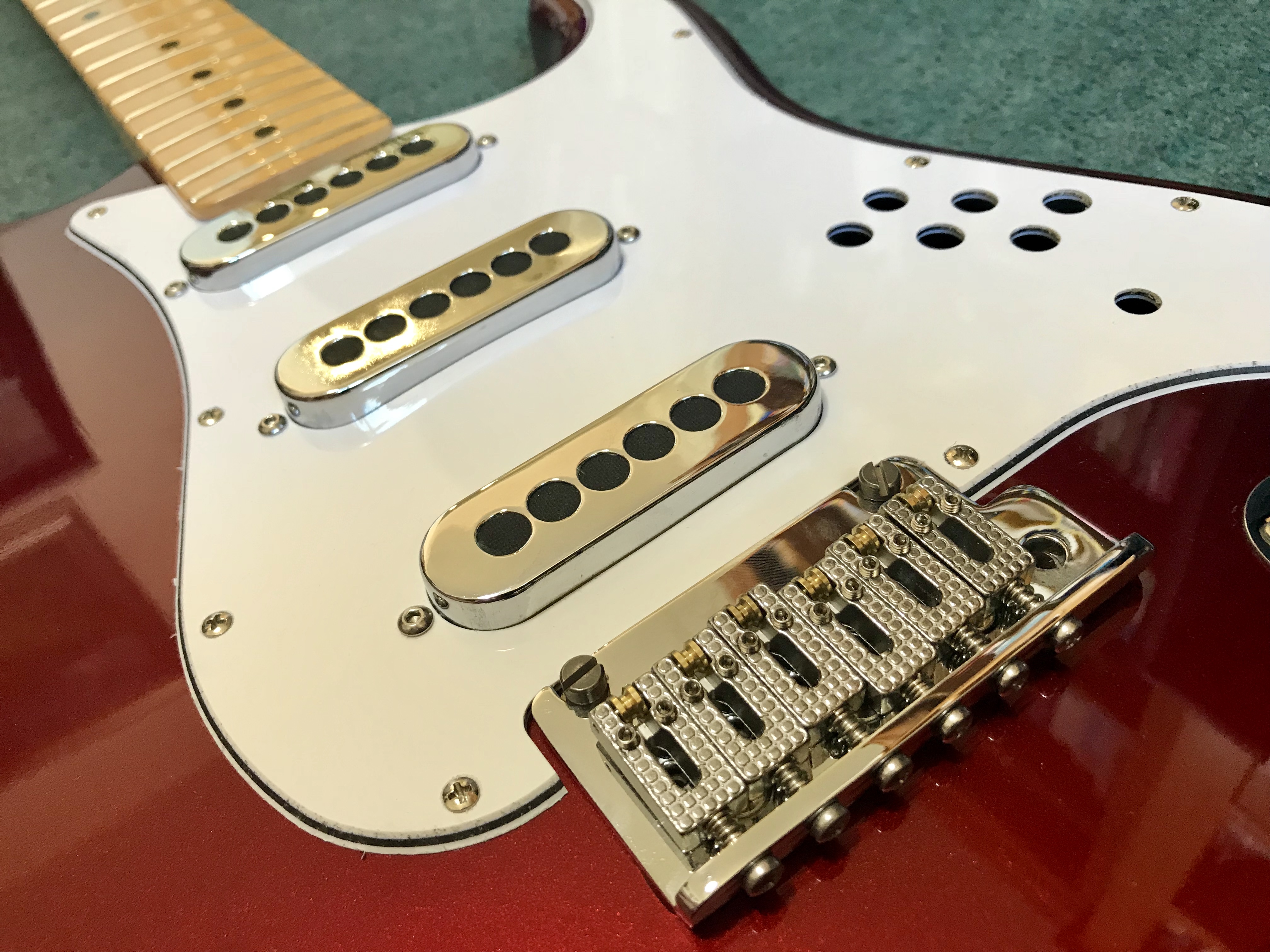 While the guitar was disassembled, it seemed sensible to upgrade the standard hardware to Fender ‘deluxe’ specification which would improve the tuning stability during heavy tremolo use. I fitted a set of Fender Schaller back-locking tuners which are essentially the same as those fitted to Brian May’s Red Special, but with all six the same instead of 3L3R versions for a symmetrical headstock. They are also customised with the Fender ‘F’ logo instead of a plain back to the adjustment screw for standard retail pieces.