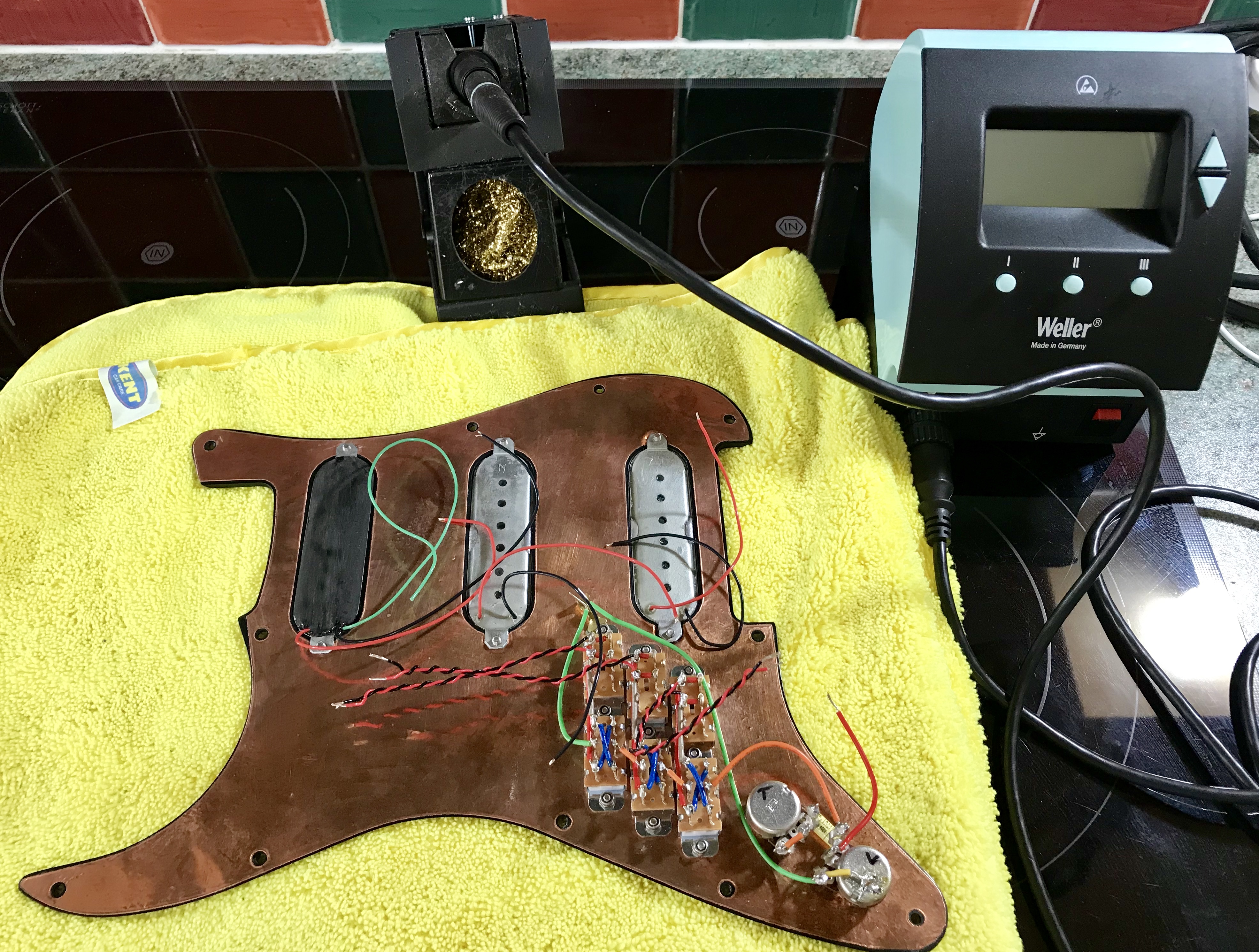 I wired up the components in the same way as my 3/4 scale Red Special ensuring a good mechanical connection by wrapping the solid tinned single core around the connection lugs before soldering with a non-RoHS compliant high lead content solder. I used lengths of black, red and green 7/0.2 mm 26 SWG PTFE insulated equipment hookup wire for connections where some flexibility was required, including twisted pairs of ‘tails’ to temporarily connect the pickups.