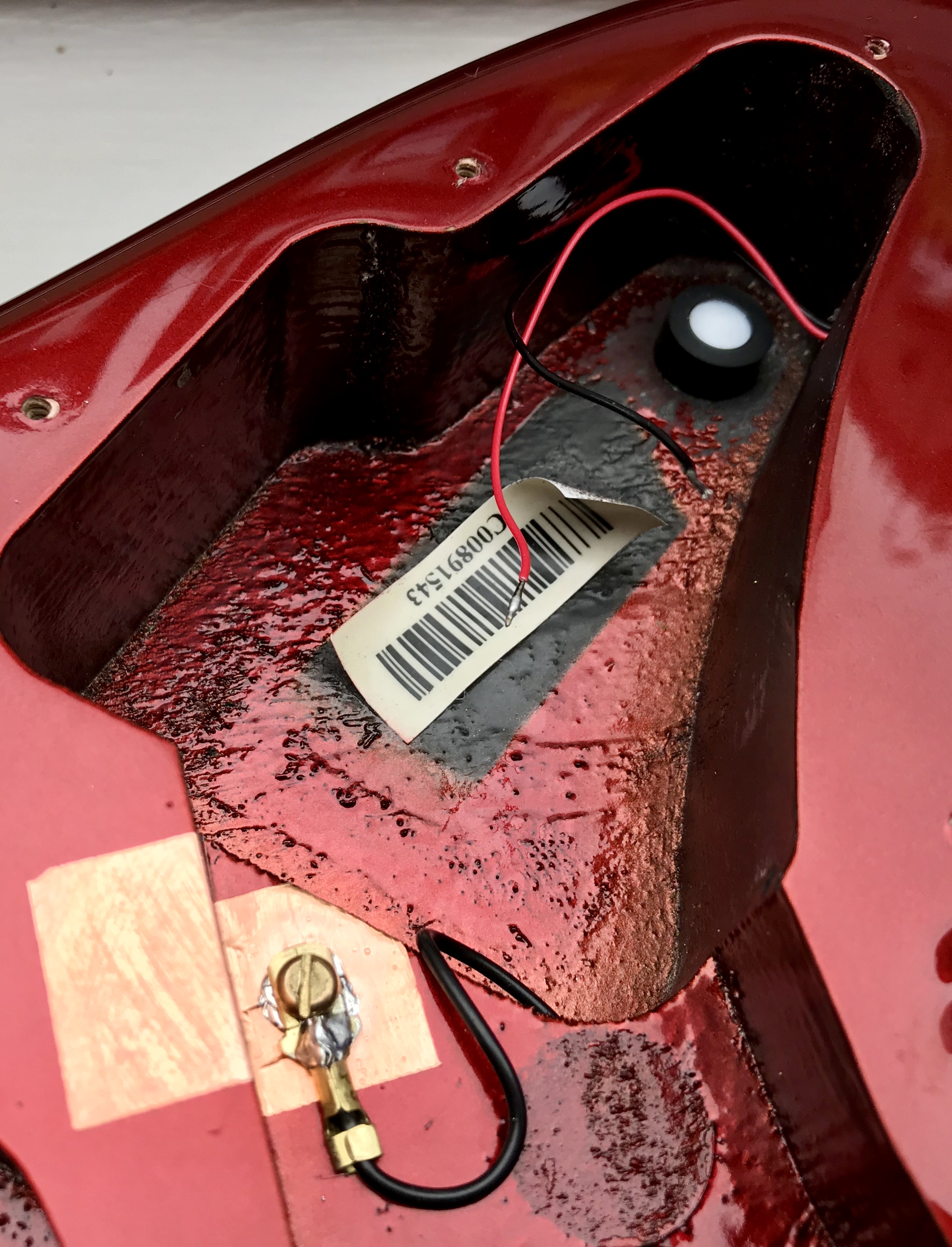 I rewired the 1/4” mono jack socket with 7/0.2, 26 SWG PTFE sheathed instrument wire and fashioned a 7 mm high support for the underside of the volume potentiometer from 14 mm o.d./8 mm i.d. black silicone hose with 8 mm diameter PTFE rod in the centre. This was glued to the control cavity floor. Final testing revealed that I need to remove a shim washer from the treble side of the bridge pickup to raise it and eliminate a source of noise caused by the copper shield on the underside of the pickguard not lying flat against the strip attached to the guitar body.