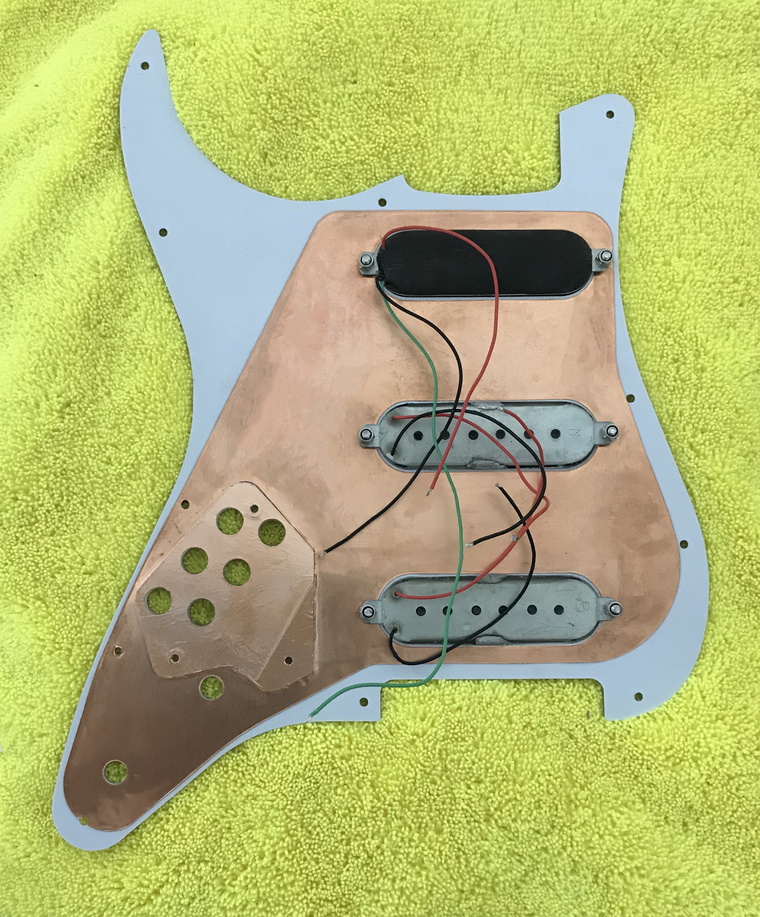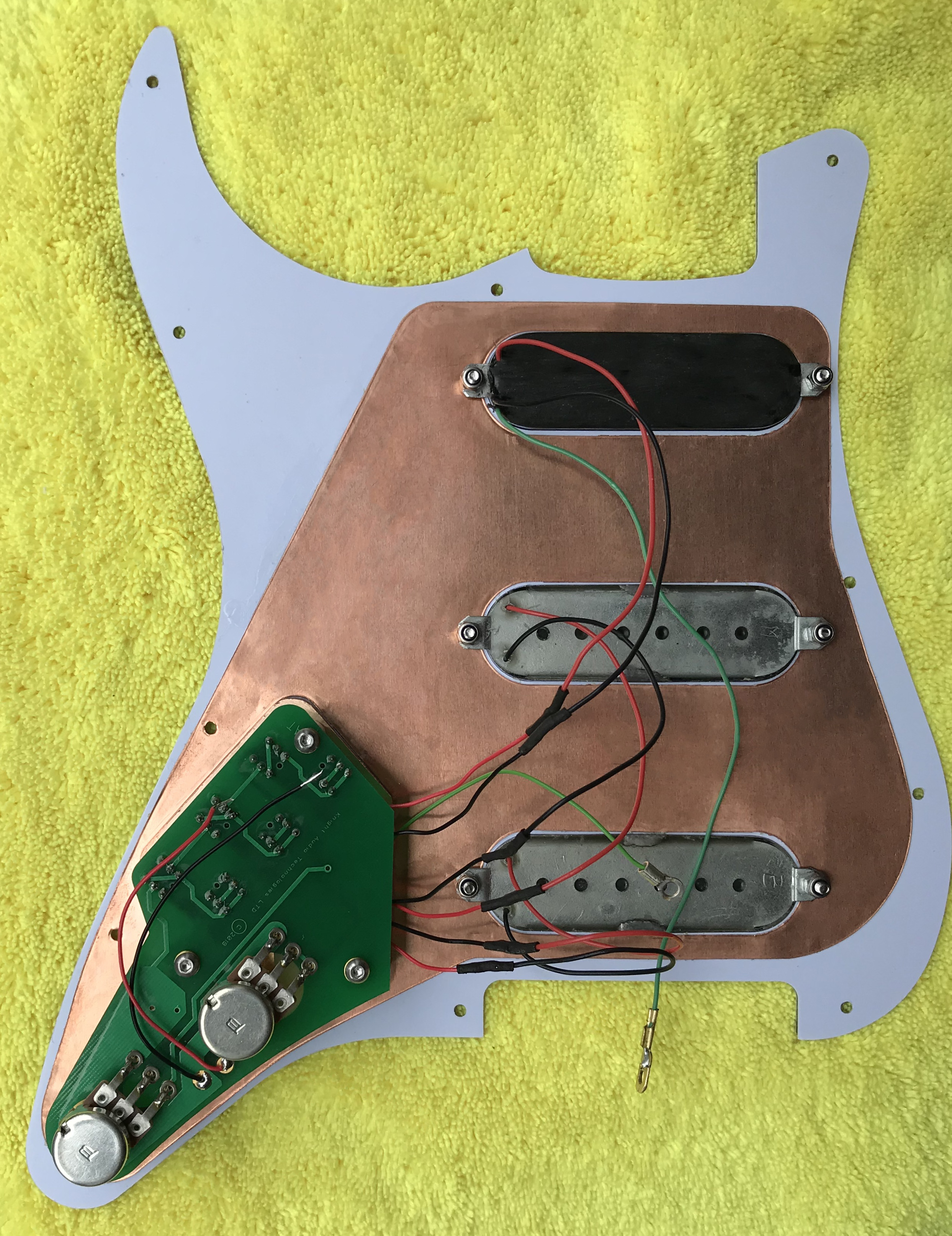 To complete this project, I CNC cut a pickguard shield from 0.127 mm thick copper sheet from Fred Aldous art and craft supplies, glued it to the back of the pickguard and applied thin, self-adhesive copper foil to the perspex PCB carrier plate. I mounted the pickups with M3 stainless steel machine screws using 0.5 mm small brass washers as shims and stainless steel nyloc nuts. The switches are fitted with 8.7 mm diameter ALPS TAK8-102 A.3.3 pushbutton switch caps in light grey from Conrad Electronic in the U.K: https://www.conrad-electronic.co.uk/ce/en/product/700605/ALPS-TAK8-102-A33-Button-For-Mains-Push-Switch