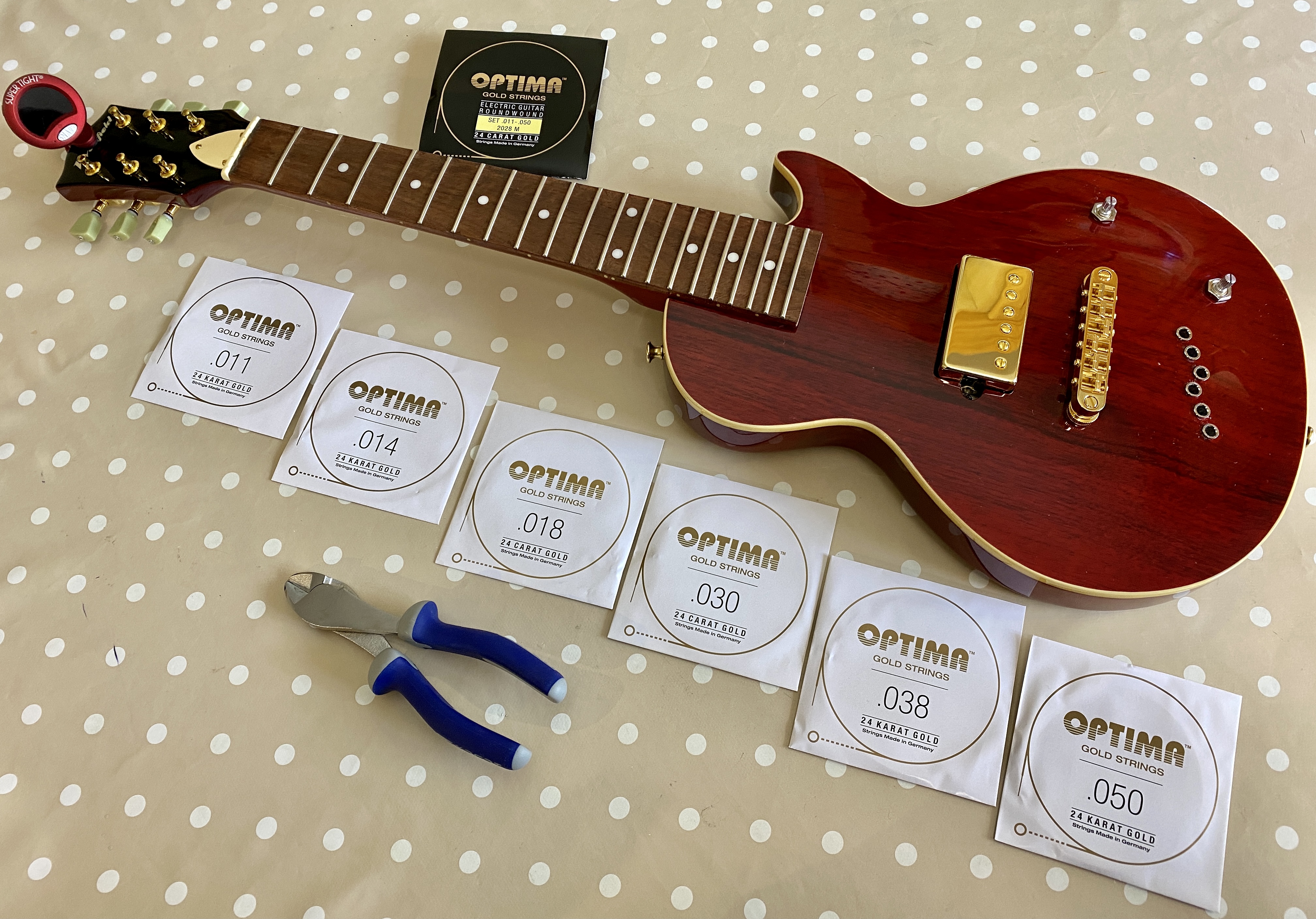 Finally, I restrung the guitar with Optima Gold 2028M gold plated strings and tested the circuit was made and the pickup responded as expected, checked for loose connections and noise and correct operation of the volume and tone controls. The testing was successful with no issues and the guitar sounds spectacular through a Vox AC30. That brings all my planned guitar projects to a close, but read on for a hint at a future project I would like to attempt.