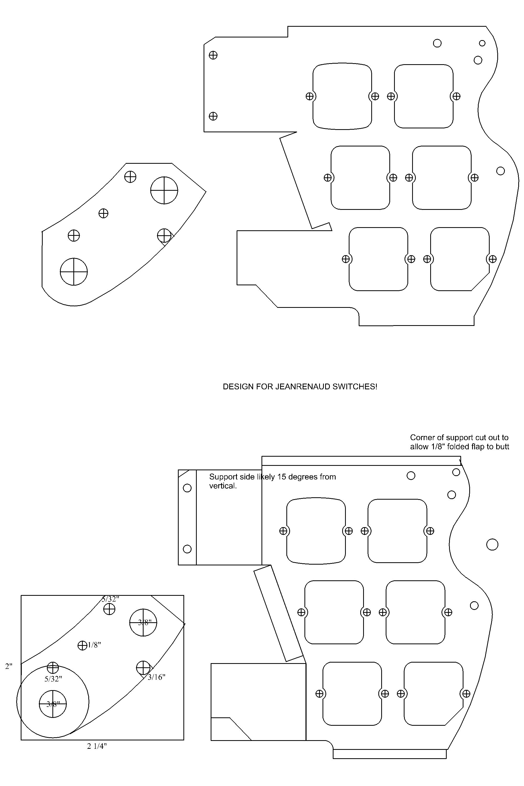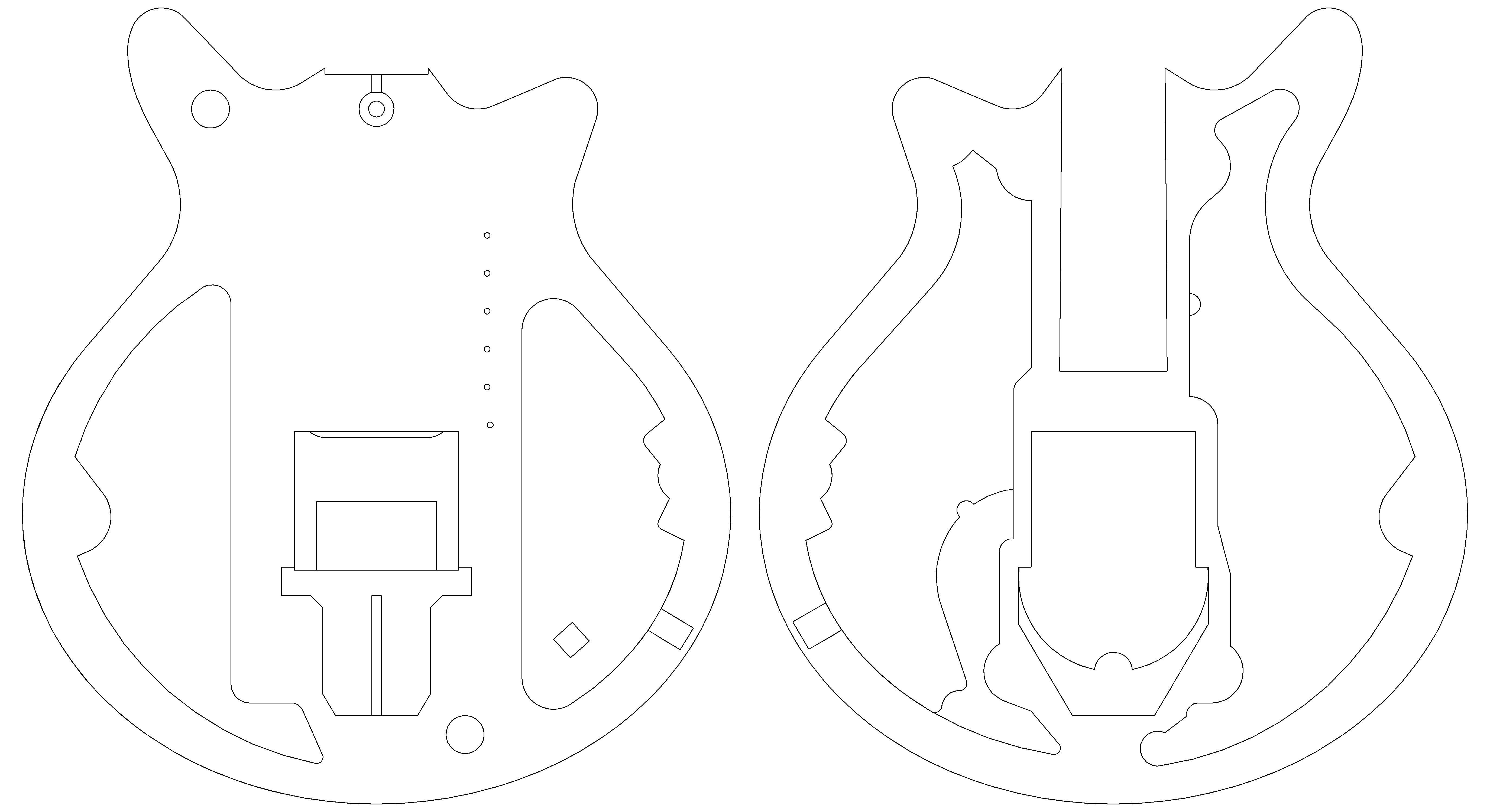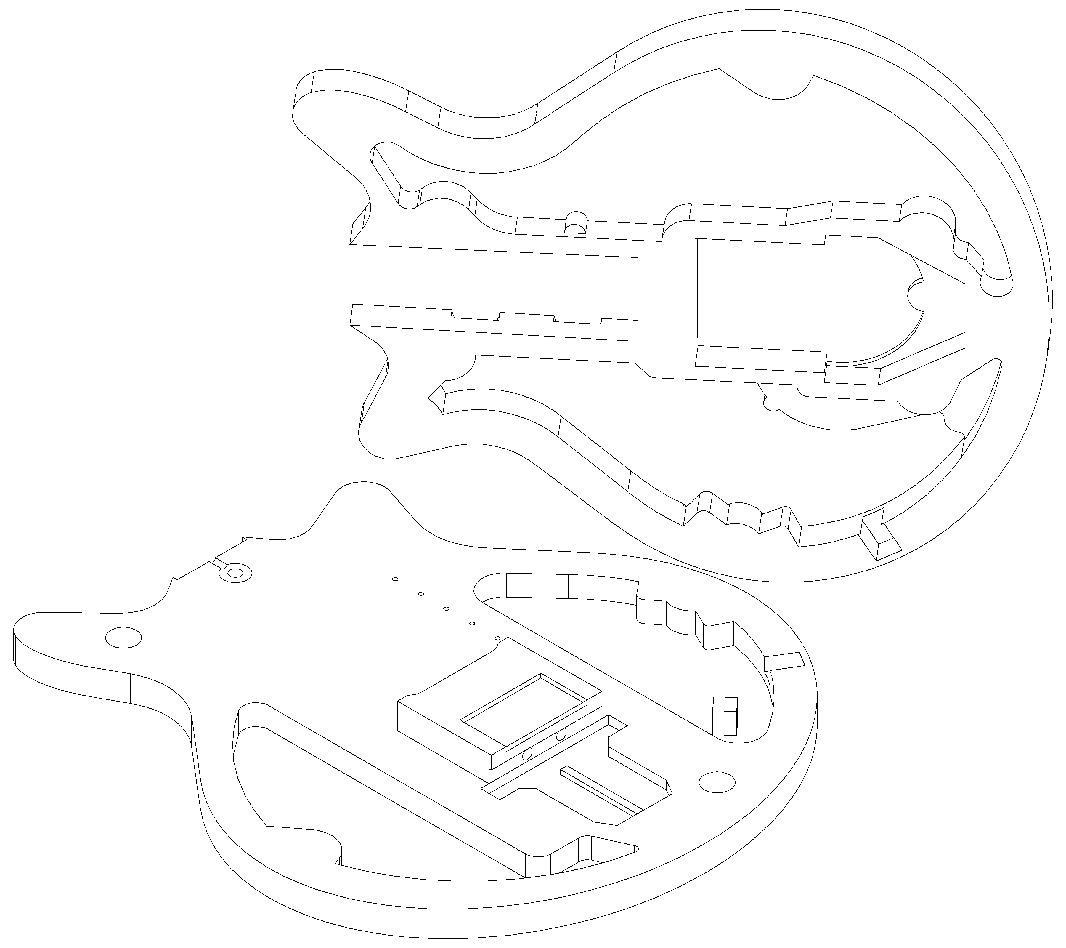 I therefore had to study the X-ray images and work up design sketches in the same manner as with the visible parts of the guitar body. The attached images illustrate the X-rays with construction lines drawn over them to form the cavities for the upper and lower sections and the design sketches I worked up from them. Note that the main body X-ray image is a montage of separate images that are pieced together. As a result, the features do not align well with the outline of the guitar and some educated guesswork was required on the position and size of the construction objects.