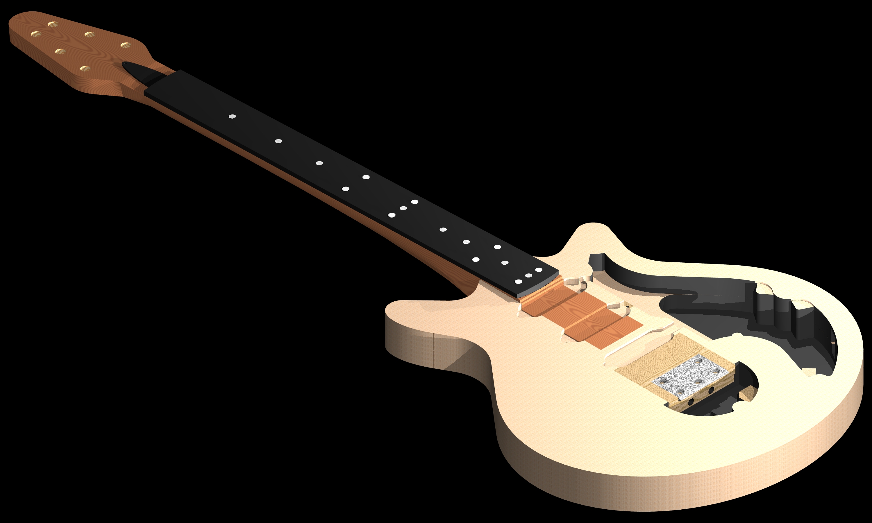 An important precursor to working up the Red Special body design in CAD is understanding the relatively complicated internal cavity structure of the guitar. Brian has stated that his goal was for the guitar to hold as much air as possible to allow it to interact with the amplified signal and feed back in a controllable way. He removed large proportion of the core softwood from the original blockboard using a wood chisel to form the acoustic cavity on the left/bass side of the guitar and a control cavity on the right/treble side of the guitar.