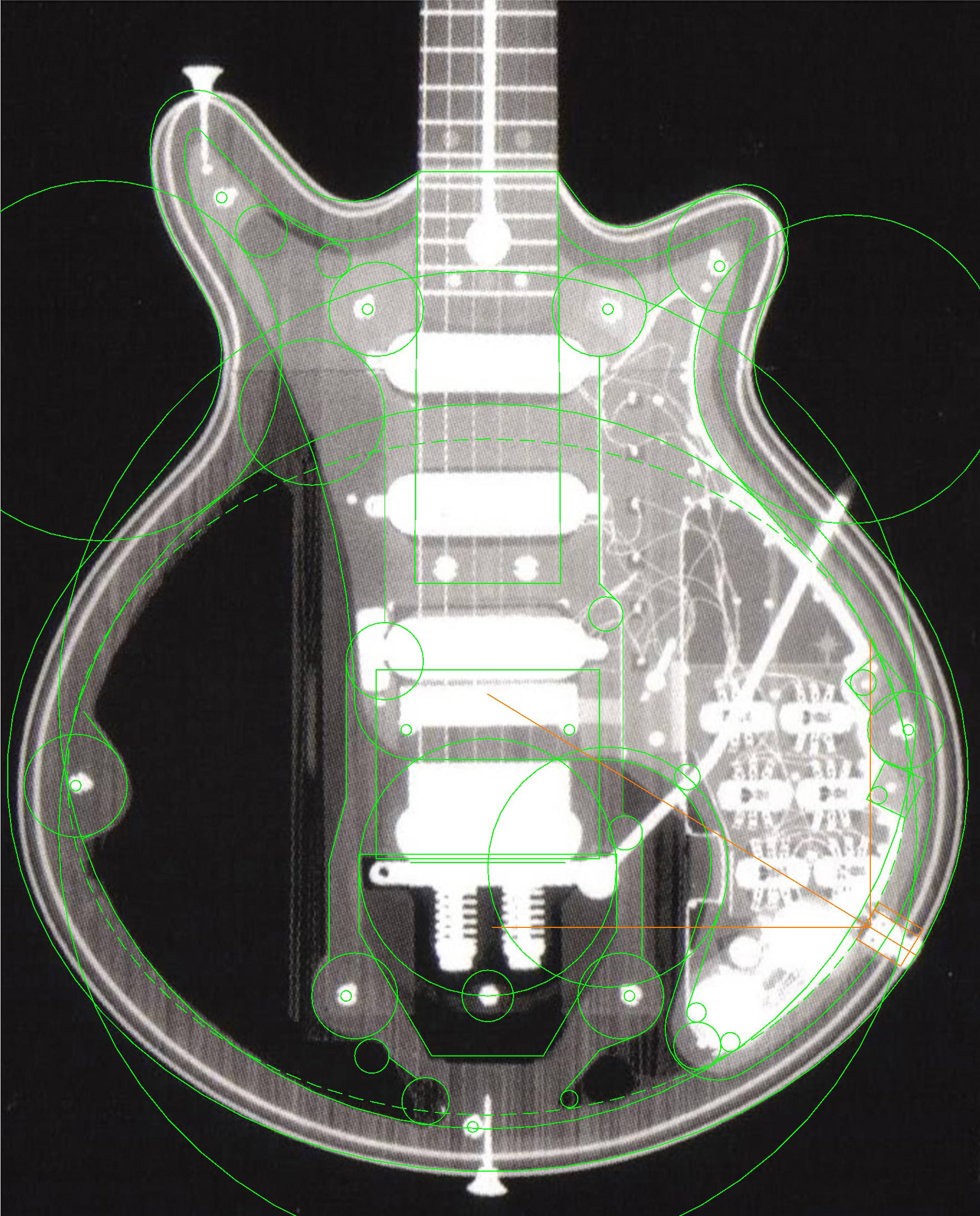Although it is relatively well known that the Red Special construction uses oak and blockboard, X-ray images were taken in 2003 at St Bartholomew’s Hospital in London to allow its internal structure to be accurately determined for the Guyton authorised replicas. Presumably this was necessary because either Brian and Harold did not make detailed plans of the internal chambers, or that the end result differed significantly from the original design sketches due to cutting errors or ‘in field’ design changes which were not then reflected on the plans.