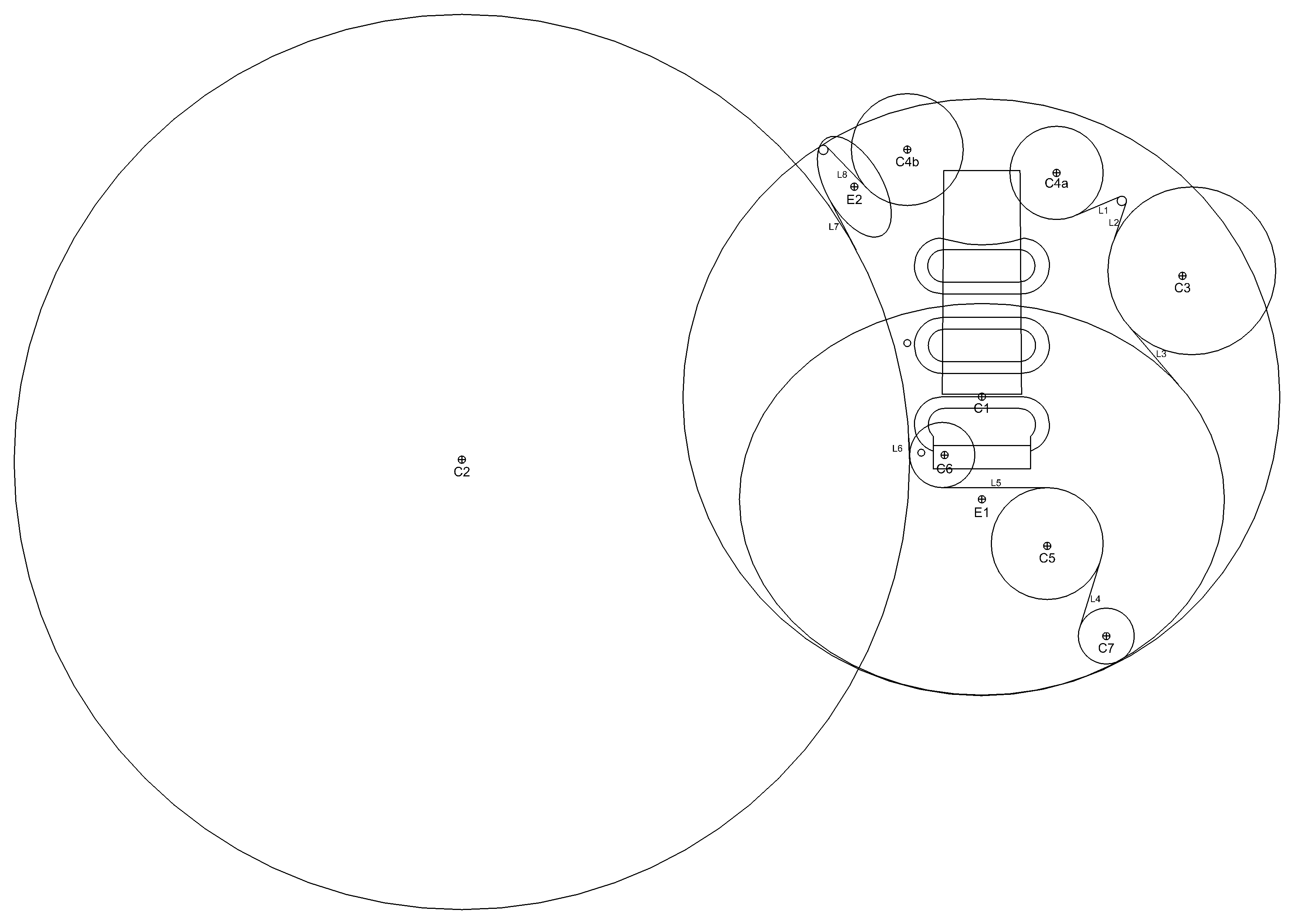 Moving forward to early 2016, after the shape fitting investigations on the Red Special headstock, I carried out an analogous study on the pickguard. It appears that the pickguard outer edge tracks the body shape with a gap of 1/2″ (12.7 mm) and, as with the headstock and guitar body, circles with regular imperial diameters were used to construct the curves and were joined up with either line segments or ellipse segments using a draughtsman’s French curve set. The sketch in the gallery below illustrates only the construction objects placed at the nearest 1/8″ locus as specified in the list below and labelled. The pickguard shape in the small horn region does not exactly fit the regular ‘theoretical’ shape I proposed and line segment L2 joining the tip to the cutaway curve is noticeably curved. Is it because the tip region was damaged during cutting and Brian had to slightly reprofile this area to smooth out the cutting error? Or was it designed like this from the outset?