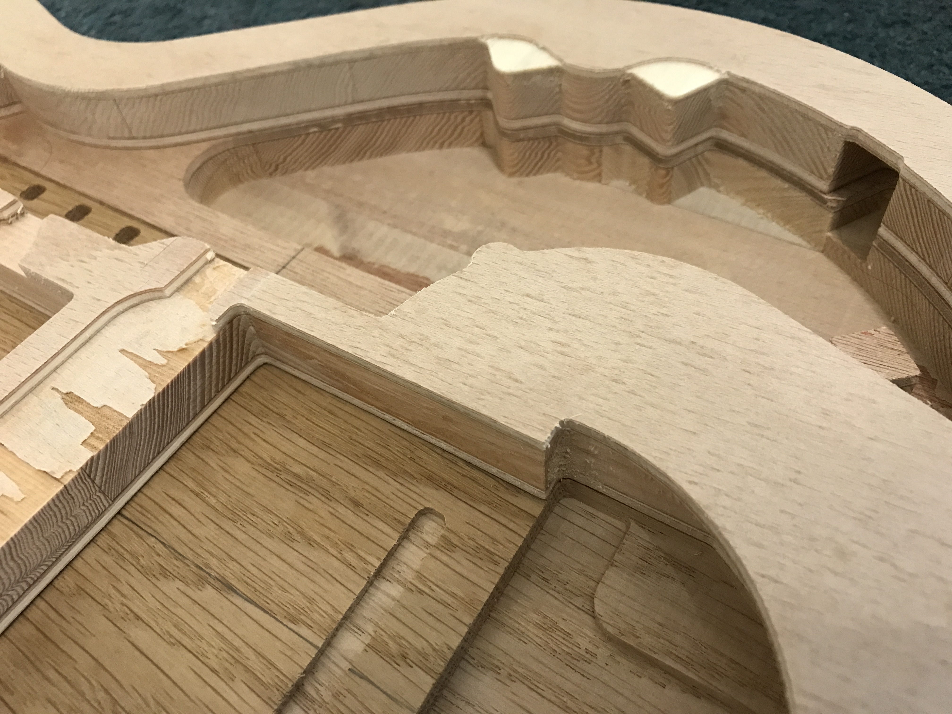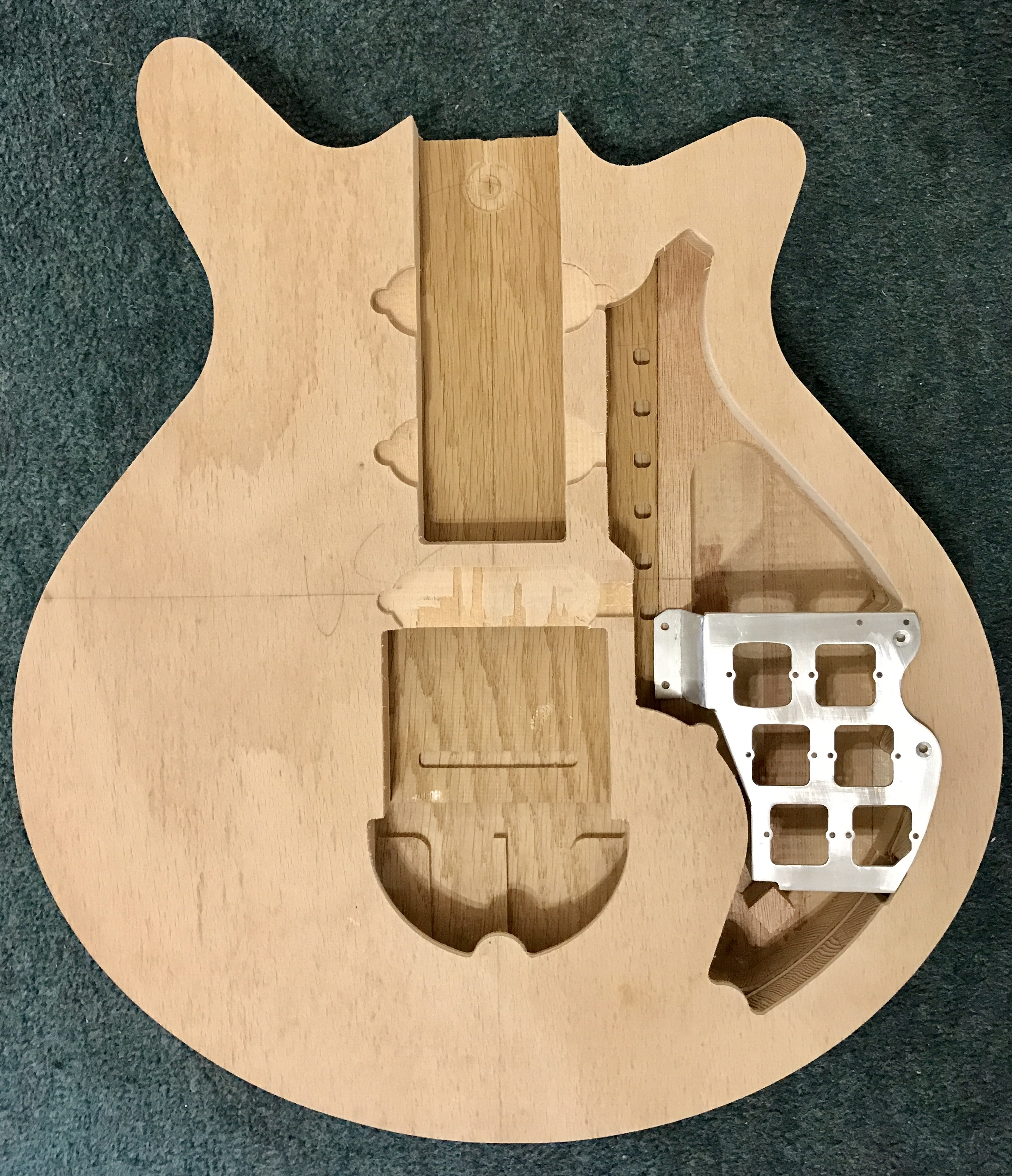 Once the final quality blockboard workpieces were ready, I re-cut the lower and upper body sections on 9th and 11th August 2017 respectively. I was satisfied with how these turned out in terms of flatness of the board and general construction, etc. The actual thickness was 19.2-19.3 mm so slightly over the nominal 19.05 mm (3/4″) but within my desired tolerance of -0.1 to +0.25 mm. The images in the gallery below illustrate the separate body sections with some close-up images to illustrate the grain. There is a sliver of outer layer of plywood left which is peeling off. I removed this and painted the plywood in the exposed cavities with Rustins blackboard paint. Other than de-burring the edges with abrasive paper, it is shown as it came off my Stepcraft CNC machine.