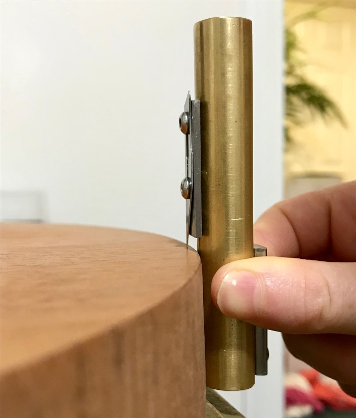 So I decided to make my own tool (as professional luthiers often have to do). This one is fashioned from a length of 5/8″ diameter brass rod which I ground flat on one face using my mini drilling/milling press by first using my CNC machine to make a holder from an offcut of Khaya Ivorensis (African mahogany) wood. I intended to mount a Swann-Morton 10A scapel/craft knife blade which is 1/64″ (0.4 mm) thick therefore I had to make two shims, one 1.8 mm thick and one 3.8 mm thick since the blade edge is 0.2 mm from the flat side of the blade. I chose to make these from stainless steel cutlery rather than try to buy metal sheet. I ground the metal billets to within 0.1 mm of the target thickness using my drilling/milling press then final thicknessed them manually.