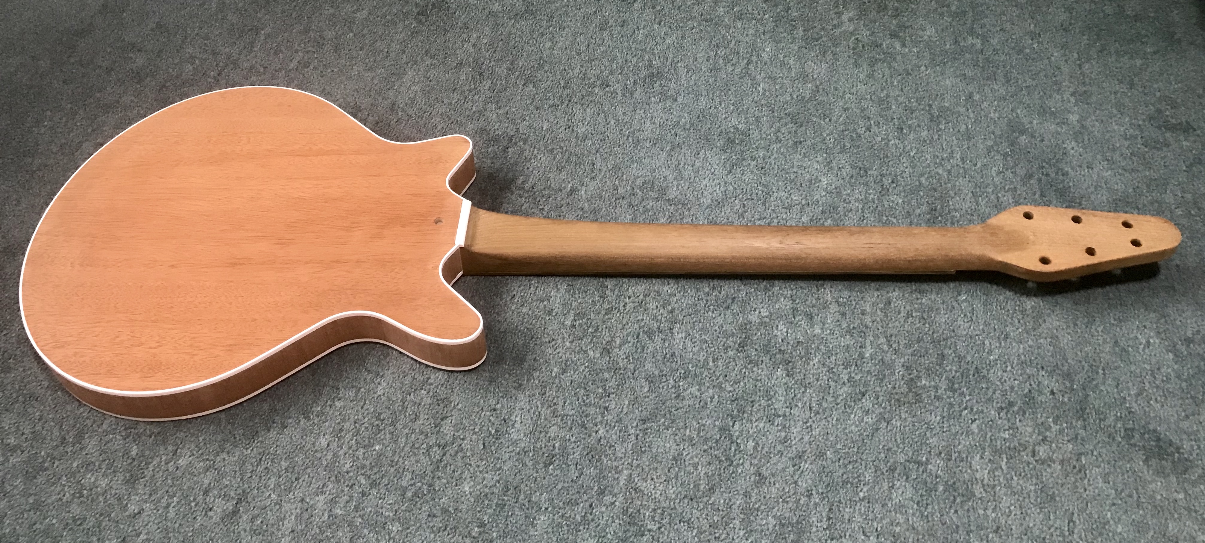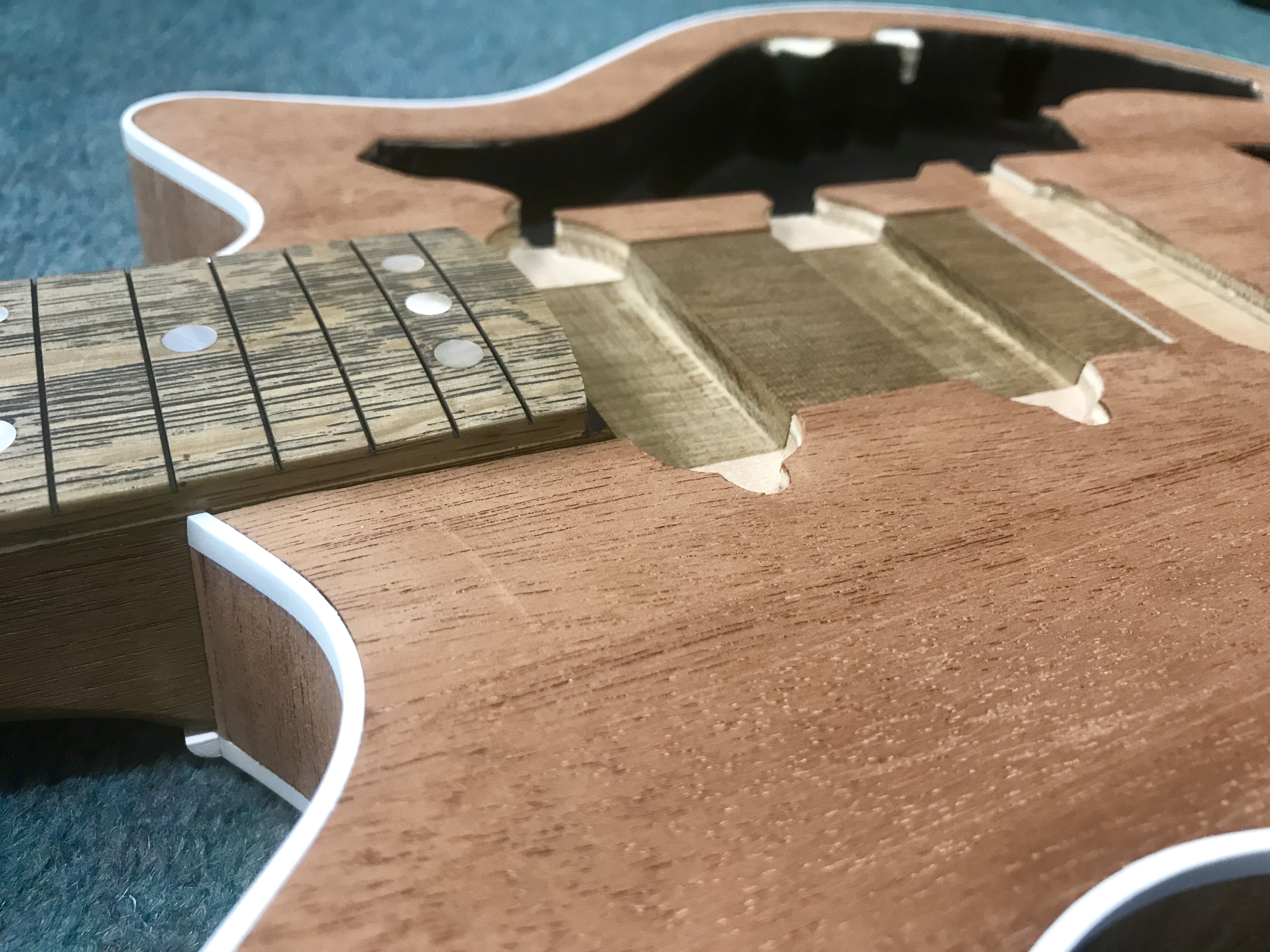 Just as with a bridge and groom and marriages in manufacturing (e.g. a car chassis or monocoque with the drivetrain), joining a guitar body with its neck for the first time can be stressful and involve a lot of preparation! At this stage in the build, I have prepared the neck for black painting the fretboard and fitting to the body, repaired the body at the apexes of the neck mortise and made the section of purfling that covers the bottom of the neck heel as it meets the body by welding four strips of CAB (Cellulose Acetate Butyrate) plastic binding together with acetone, milling it to the correct thickness and rounding over the front edge. I fettled the body mortise and neck tenon to allow them to marry together to check the accuracy of fit; the largest source of error being the two sided CNC cut of the neck. The fit is largely satisfactory.