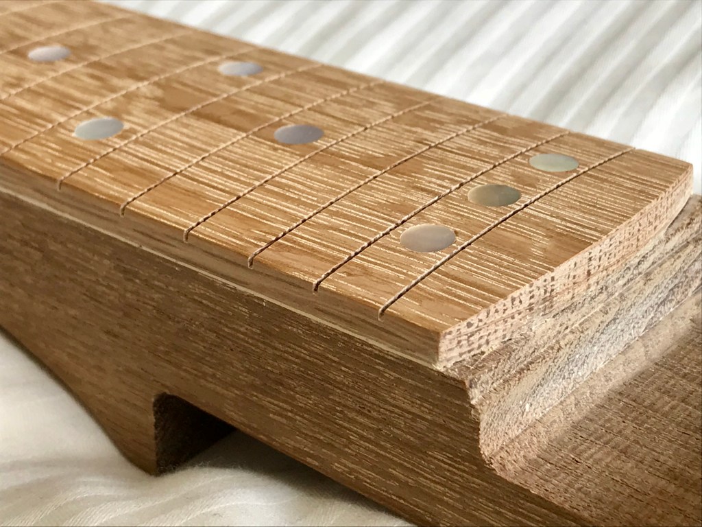 I prepared the fretboard for finishing by grain filling using W S Jenkins black Jecofill then flatting back with super fine grade wire wool and applying masking dots over the MoP fretboard markers. I masked the fret slots themselves with strips cut with a craft knife from 0.6 mm PTFE/Teflon sheet. I masked the join between the oak fretboard and mahogany neck on the neck side using 3M blue vinyl tape to obtain a sharply defined border and masked off the remainder of the mahogany neck with blue Scotch masking tape before spraying several coats of Plasti-Kote black undercoat on the fretboard.