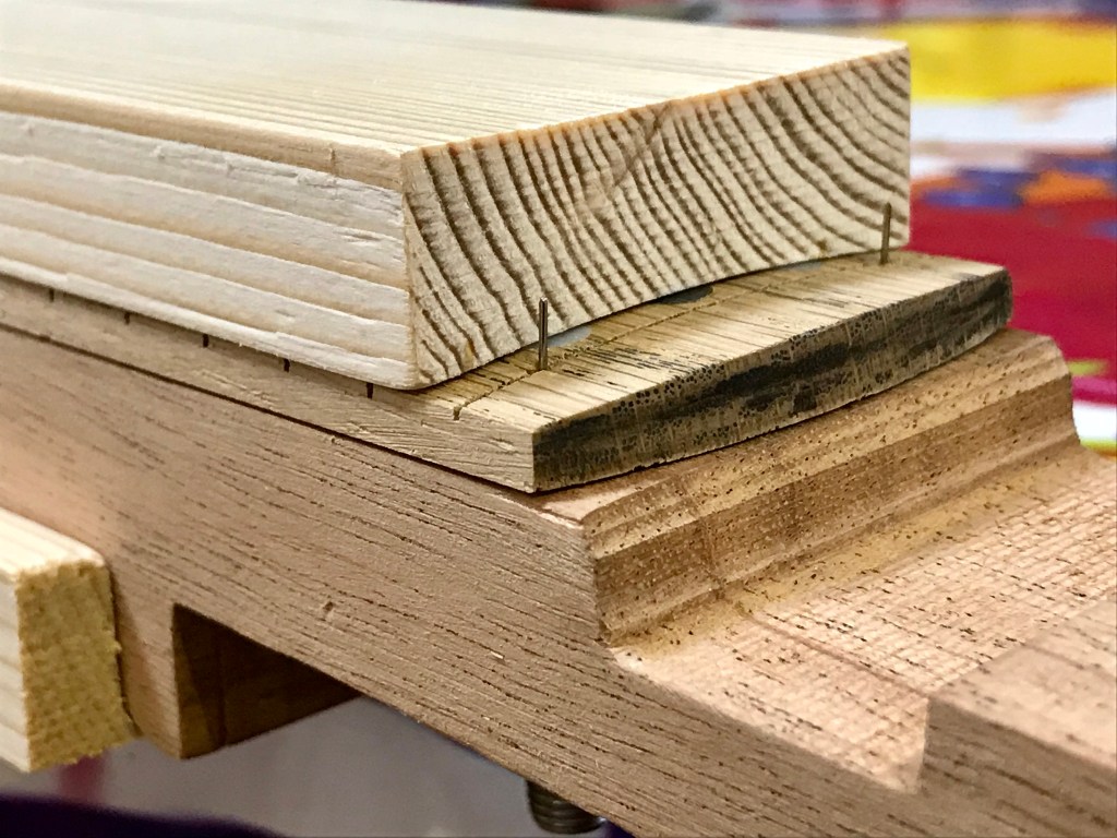 I carried out a test on the rough/test Khaya neck and oak fretboard, pinning the fretboard to the neck by drilling two 0.6 mm holes in the zero fret and the 24th fret with carbide drill bits (for stiffness) then inserting 0.6 mm diameter (23 SWG) stainless steel wire to hold it in position during gluing/clamping. This worked well so I proceeded to glue up the assembly again.
