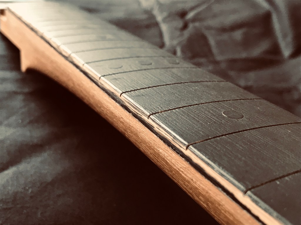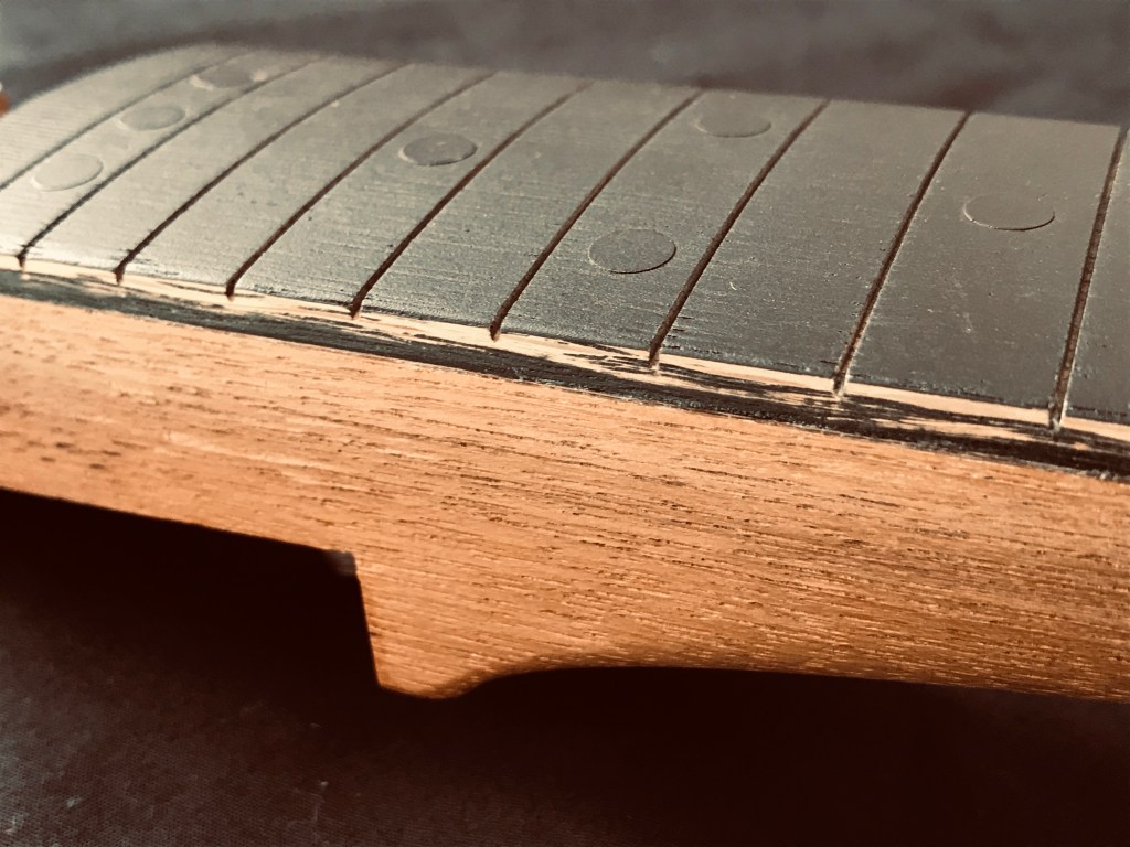 It is common practice to achieve this using panel pins which are 1/16″ (1.6 mm) diameter; the resulting larger hole will of course be hidden under the fret crown but I wondered if it was possible to do it in a more discreet way and still achieve a precise result. This appears to work and the increased stiffness of the stainless steel wire over standard steel wire undoubtedly helps in this regard. At this stage, the neck is ready for a recoat of Plasti-Kote on the edges before moving forward to applying the gloss black top coats.