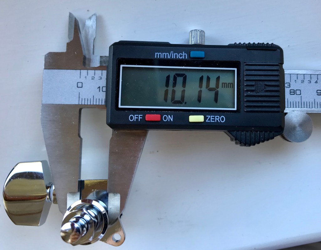 The tuner holes in the headstock were initially drilled to 3/8″ (9.5 mm) diameter then reamed accurately with a reamer of specific diameter to match the shaft diameter of the Schaller M6 3L3R chrome locking tuners (9.80 +/- 0.05 mm). However, I noticed when checking the actual diameter with digital calipers that three of the tuners in the set I bought two years ago have a non-uniform shaft diameter; this tapers to 10.10 +/- 0.05 mm at the base, presumably due to a manufacturing issue during chroming. The supplier (Touchstone Tonewoods) agreed to replace that set but it is worthwhile checking the actual dimensions of every component before fitting, especially if fine tolerances are required to ensure the correct fitting.