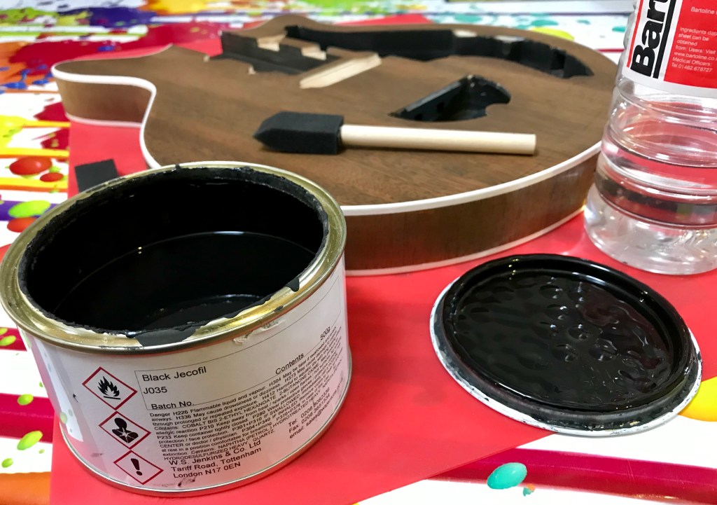 I filled any voids and made good the join between the veneer and the edge binding where necessary using Milliput white epoxy putty. This sets rock hard but has the advantage of being able to be wiped off with water during the workable phase. I masked off the join with 3M blue vinyl tape to obtain a sharp, well-defined edge. Some luthiers prefer to adhere the plastic edge binding by softening it with acetone (2-propanone) or using a binary mixture of acetone and dissolved plastic pieces as the adhesive formulation. Although I would not seek to dissuade anyone from using a system that they are accustomed to and works for them, my preference is to avoid using acetone other than as a general purpose solvent for the following reasons: