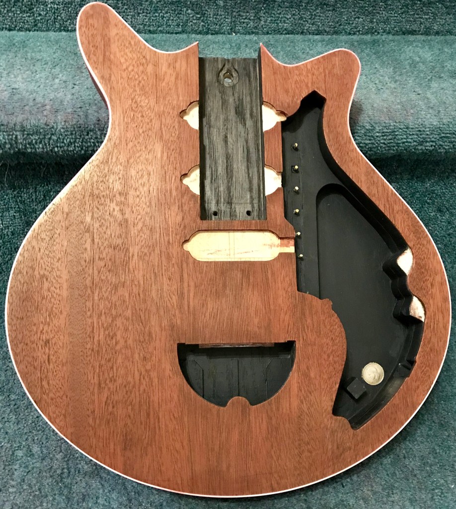 Moving onto applying the stain, I decided to use only red mahogany Rustins wood dye instead of the 80:20 red/brown mahogany mix I used on my 3/4 scale Brian MAy Red Special build because the veneer turned out to be very brown after removal of the grain filler. I understand from Greg Fryer that Brian applied only red mahogany Furniglas brand wood stain to the original Red Special and over time, the hue has faded/changed to a more orange-brown. Finding a suitable stain to yield an authentic representation of the original guitar is therefore a challenge.