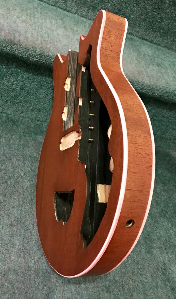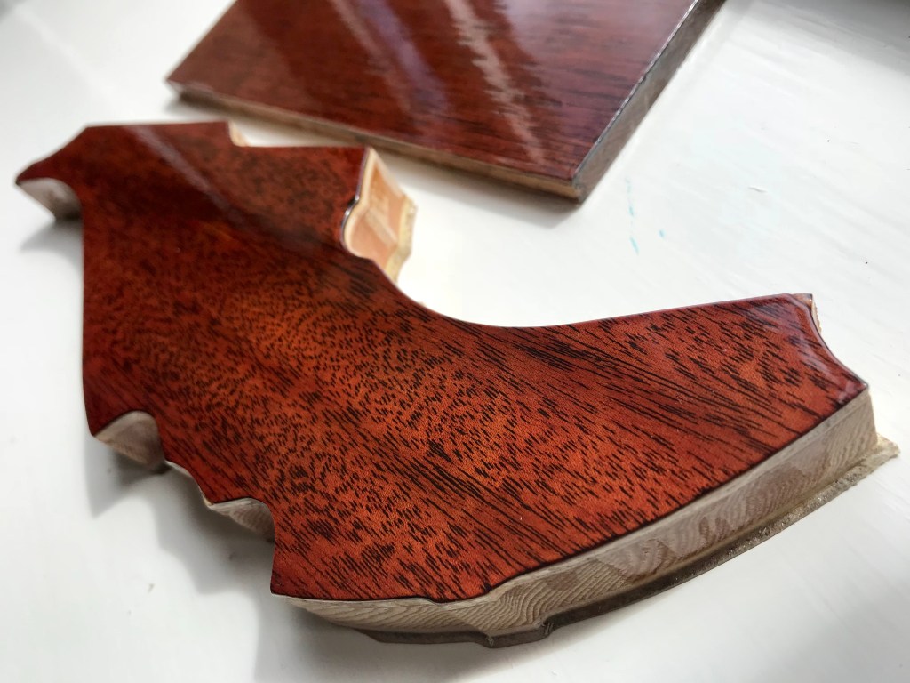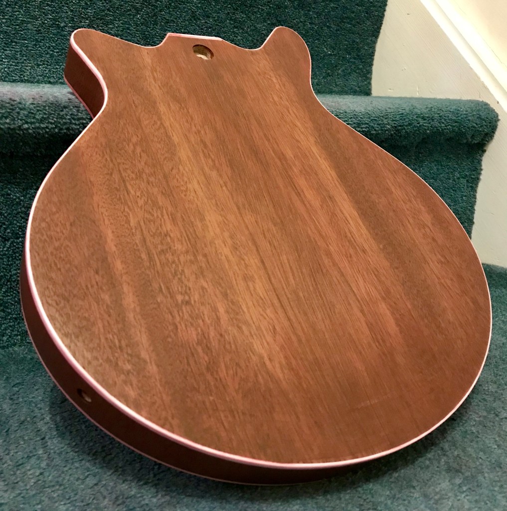 I prefer black grain filler because this accentuates the chatoyancy (Tiger’s Eye) characteristic inherent in the mahogany and looks very similar to Brian May’s Red Special, although of course, a neutral or brown filler can be used if this is your cosmetic preference. The appearance of the wood changes quite unnervingly at each stage of finishing; after this treatment, the colour of the wood alters from a salmon pink hue to a walnut brown. After applying the mixture of red and brown Rustins stains, the wood can appear a disappointingly dull pinkish red but changes dramatically once again when the clear lacquer coat is applied [see attached images of the test blocks I prepared some time ago].