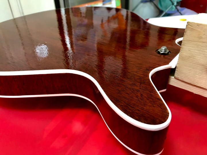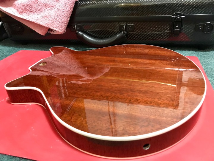 The back of the guitar body showing the desired orange-brown hue and dark grain after the first coat of Rustins Plastic Coating (RPC) has been applied.