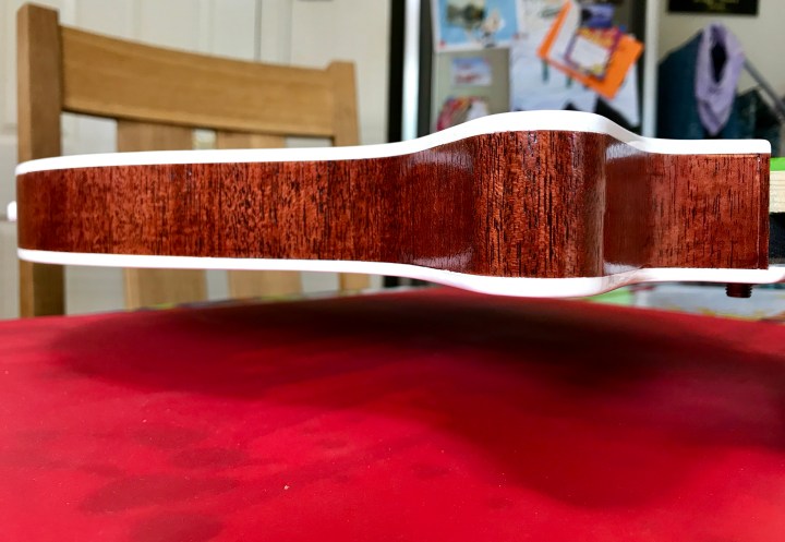 A close up photograph of the vertical grain of the quarter cut mahogany veneer on the side of the guitar body. Despite a clean rout of the binding rebate, some remedial work at the join between the veneer and the binding was required. I filled most gaps with Milliput white epoxy resin but this region trapped stain and had to be cleaned up with white spirit and then touched up with white Plasti-Kote aerosol spray. I sprayed this into a small plastic pot, waited for it to thicken slightly by allowing the solvent to evaporate off before applying it with a quality detail watercolour brush in the same manner as a vehicle coachwork painter.