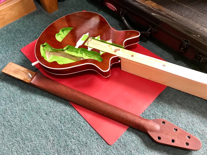 Before working on the body, I applied layers of Rustins Plastic Coating (RPC) to the neck and fretboard beginning on 5th January 2019. Although this was generally satisfactory, I experienced some setbacks including an inadvertent stripping of some lacquer layers when removing masking tape and some minor sand-through to the wood. I used two workarounds to rectify this including tinting of an aliquot of RPC using mahogany spirit power dye in the former case and re-staining the wood and re-lacquering in the latter. I also experienced difficulties retaining the black paint on the top edge of the fretboard and in retrospect, a pre-stain of the oak with Liberon spirit wood dye (which penetrates the wood rather than adsorbs to the surface) would have helped alleviate this issue.
