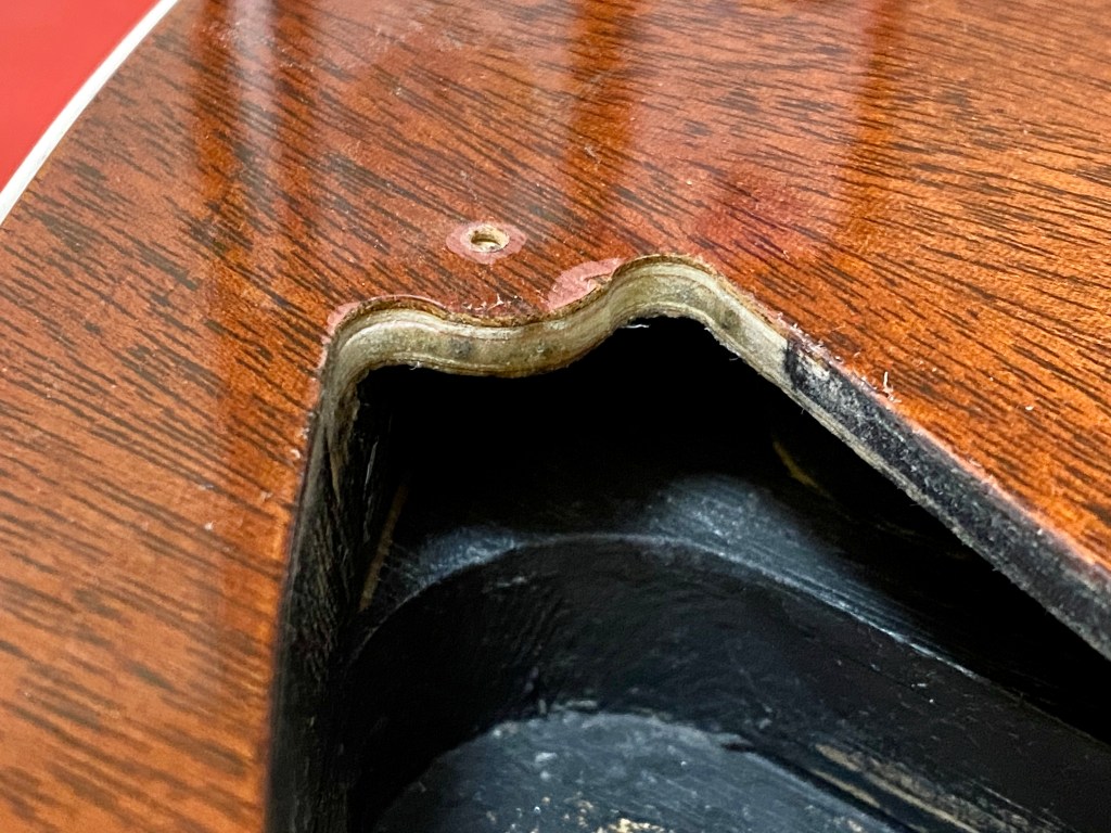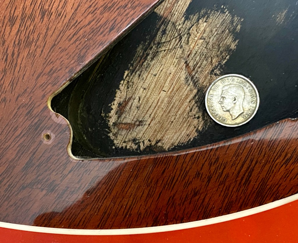 (b) Another modification required to allow the potentiometer and capacitor mounting plate to be positioned correctly was a reprofile of the overhang region adjacent to the volume potentiometer shaft where the pickguard mounting screw is located. I drew up my plans using the x-rays and overhead photographs of the original guitar in the public domain. These all have parallax error to a greater or lesser degree, so evaluating the shapes of the control cavity involved a good deal of judgement and cross-checking. I eventually reached the point of diminishing returns with this iterative process during the design phase and resolved to make it fit during final assembly. I carefully drilled out the region to a more suitable profile using a 1/4″ router bit, finished it off manually with my preferred type of abrasive paper: 120 grit 3M Stikit Gold.