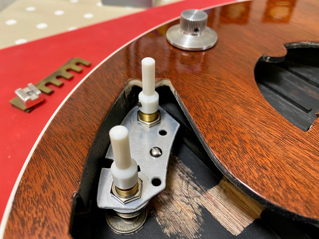 (c) I test fitted the roller bridge for the first time after gluing in the 12 mm high brass inserts and abrading dried superglue off the lacquer surface. These inserts have a heavy diamond pattern knurl turned into the outside surface and are internally tapped with an M3 thread, the nearest metric equivalent to the original which used 6BA Hank rivet nuts. Various designs of brass insert for wood and plastic are freely available now but in 1963, it was another intelligent solution by Brian and Harold. I originally planned to install Hank rivet nuts but I deemed these custom inserts which came with the hardware set a better option. The alignment was highly satisfactory but required the holes in the pickguard to be opened out to 1/8″ to allow some clearance.