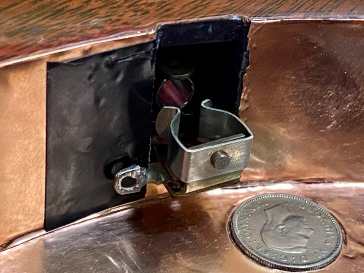 With any newly built guitar, let alone a replica of a unique DIY built instrument, no assumptions can be made about any of the physical dimensions such as when setting up a factory built standard design. The first step was to measure the action at the 17th fret and reduce the thickness of the 1/16″ tufnol shim plate supplied with the bridge. I found that the action at the 17th fret was 2.0 mm compared to my desired height of 1/16″ (1.6 mm). To help determine the required Tufnol shim thickness to achieve this, I loosened the strings, removed the shim and measured the action again. Without the 1/16″ thick tufnol shim in place, the action had reduced to 1.0 mm. I ended up at half thickness, i.e. 1/32″ (0.8 mm) to achieve the desired action. At this point, somewhat inevitably, several strings buzzed when played open and there was a degree of tuning instability when operating the tremolo, presumably as a result of string resistance on the nut slots which I had cut quite tight to the deployed string gauge. I will address this at a later date.