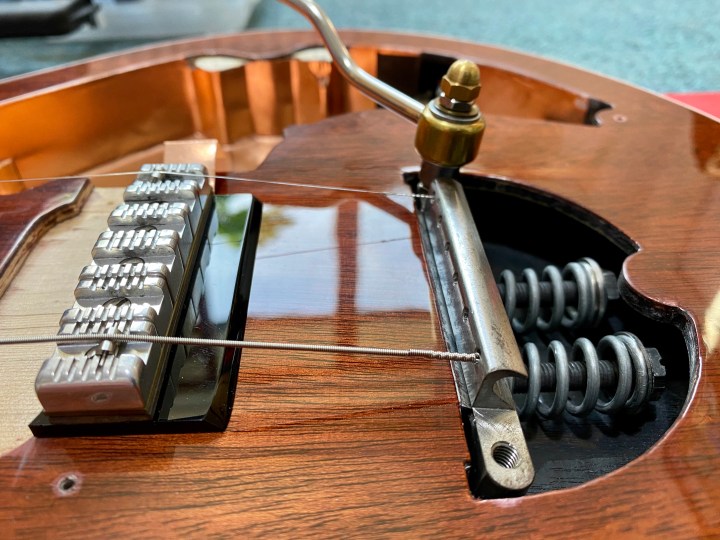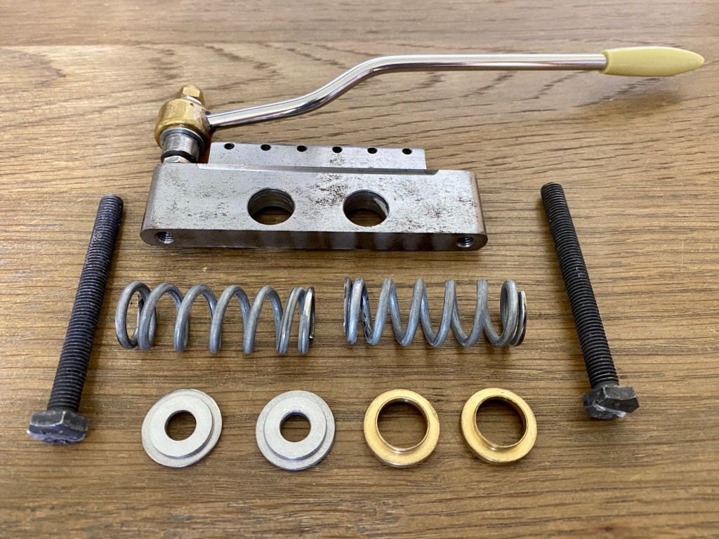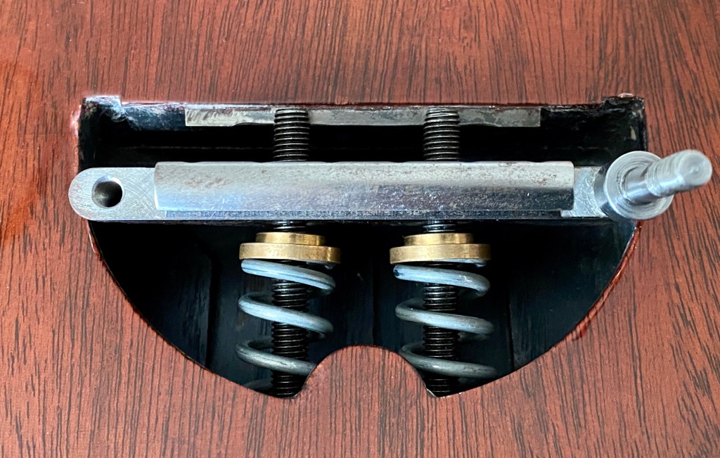 The first issue was that the 2 3/4″ (70 mm) long tremolo bolts were around 3/32″ too long to fit in the tremolo cavity (they wouldn’t fit past the fulcrum plate in any orientation) so I had to grind them down. As an aside, I struggled to obtain 1/4″ UNF x 2 3/4″ hexagonal head self colour set screws (i.e. fully threaded bolts). 2 1/2″ and 3″ were easy enough to find but the shorter length proved unsuitable. I eventually sourced these from the Arun Fastener Company in Arundel, Sussex who stock a large variety of fasteners in imperial dimensions.