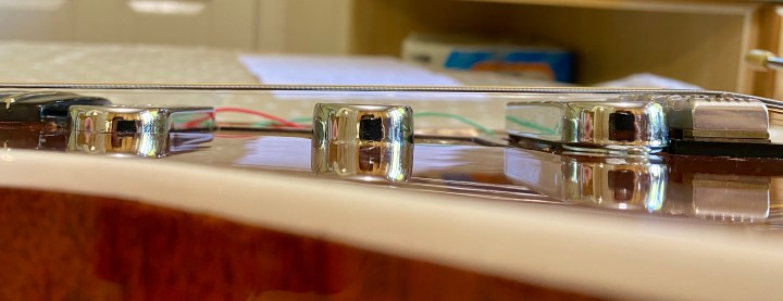 Having achieved a satisfactory playing action, I then estimated the thickness of shims required to set the pickups to the accepted distance from the strings. I have previously set up my converted Fender Stratocaster and Guyton RS Transporter using the straightforward method of fretting the high and low E strings at fret 24 then adding shims until all the pickups are at a set distance (around 1.0-2.0 mm) from the strings while allowing sufficient clearance for string vibration amplitude. However, Greg Fryer published a set of measurements from his restoration of Brian’s original guitar in 1998 which do not confirm to this scheme. The playing action was not referenced and the measurements were taken from the unfretted strings to the pickup casing. I decided to set up my RS to these measurements using custom made shims made from 8.5 mm diameter PTFE tube. Evidently, this scheme should only yield similar tones to the original if the electromagnetic characteristics of the pickups are very close to those of the original guitar. The pickups I fitted to this guitar are “Original BM/Guyton spec.“ Burns Tri-Sonics I bought retail in January 2016 from Adeson and were hand made to match Brian May’s original set as closely as possible.