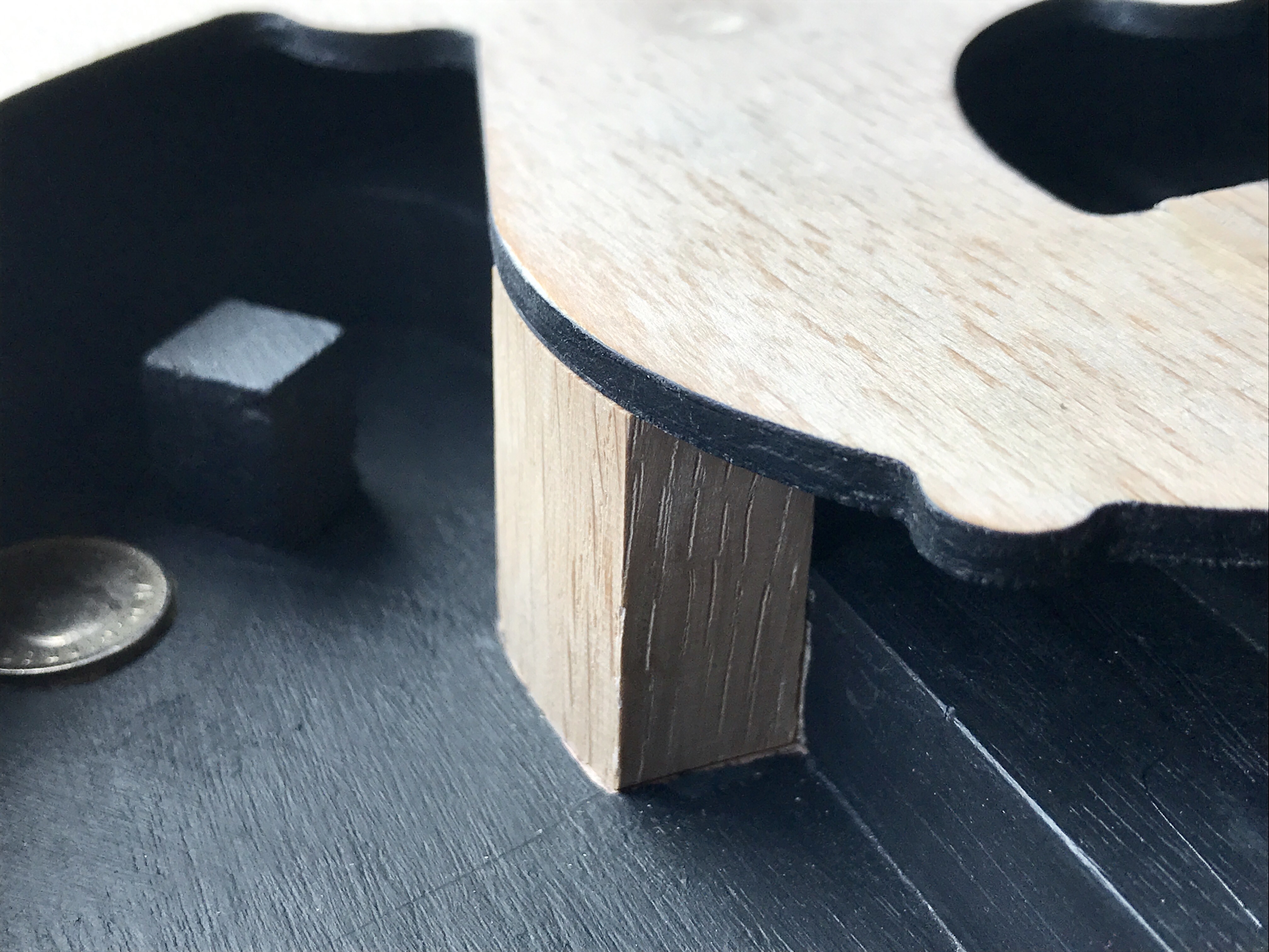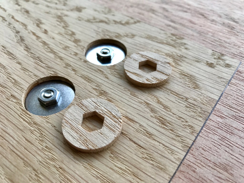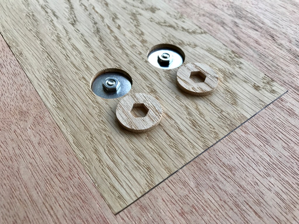 I used my CNC machine again to reduce the thickness of an oak panel to 1/8″ using a large diameter cutter. Then using a 2 mm diameter 2 flute bit, cut the oak plugs with hexagonal hole and filed the corners out a little with a diamond file. The oak plugs were glued in using superglue and abraded flush with the surface. I filled over the countersunk machine screw heads with epoxy resin and the wood screw heads with Ronseal wood filler, allowed these to dry then abraded flush with the surfaces.