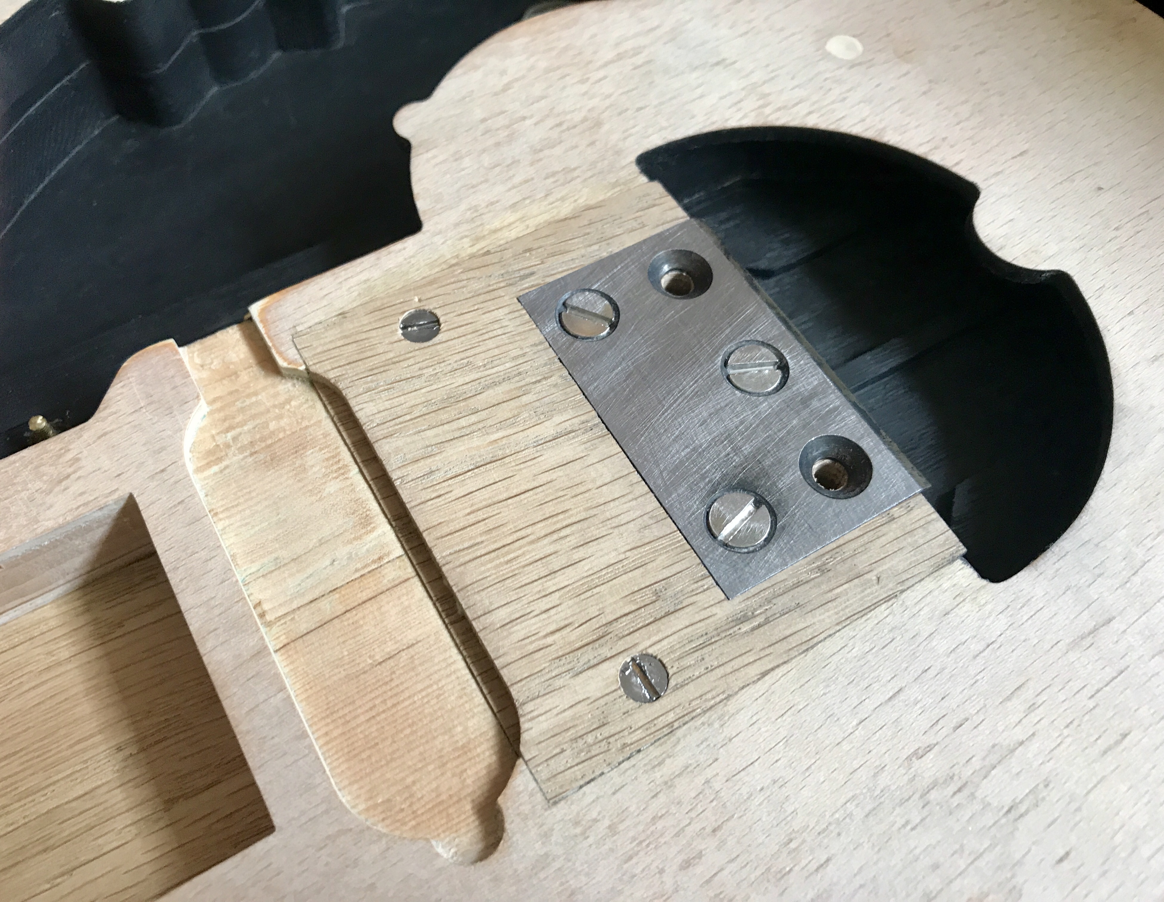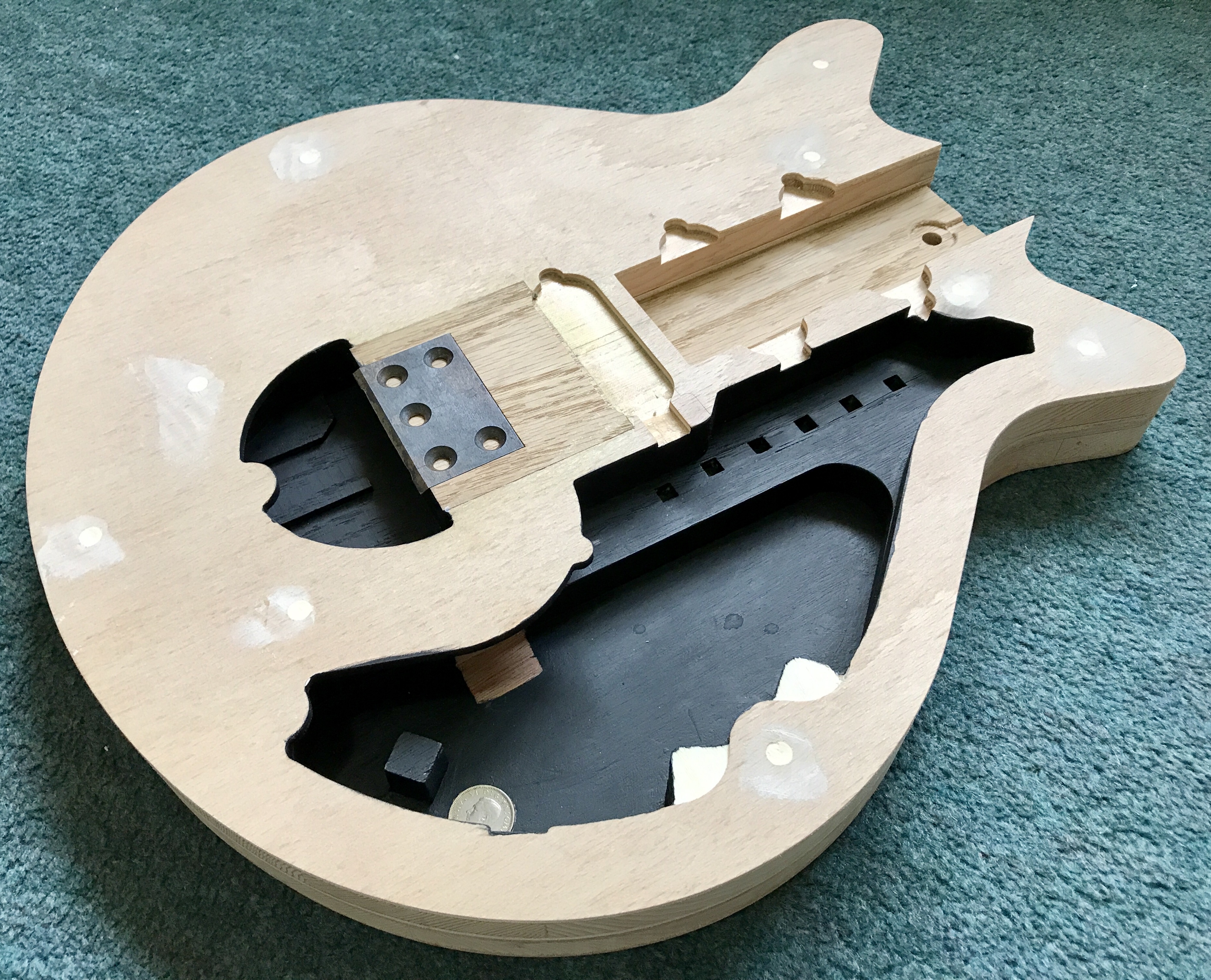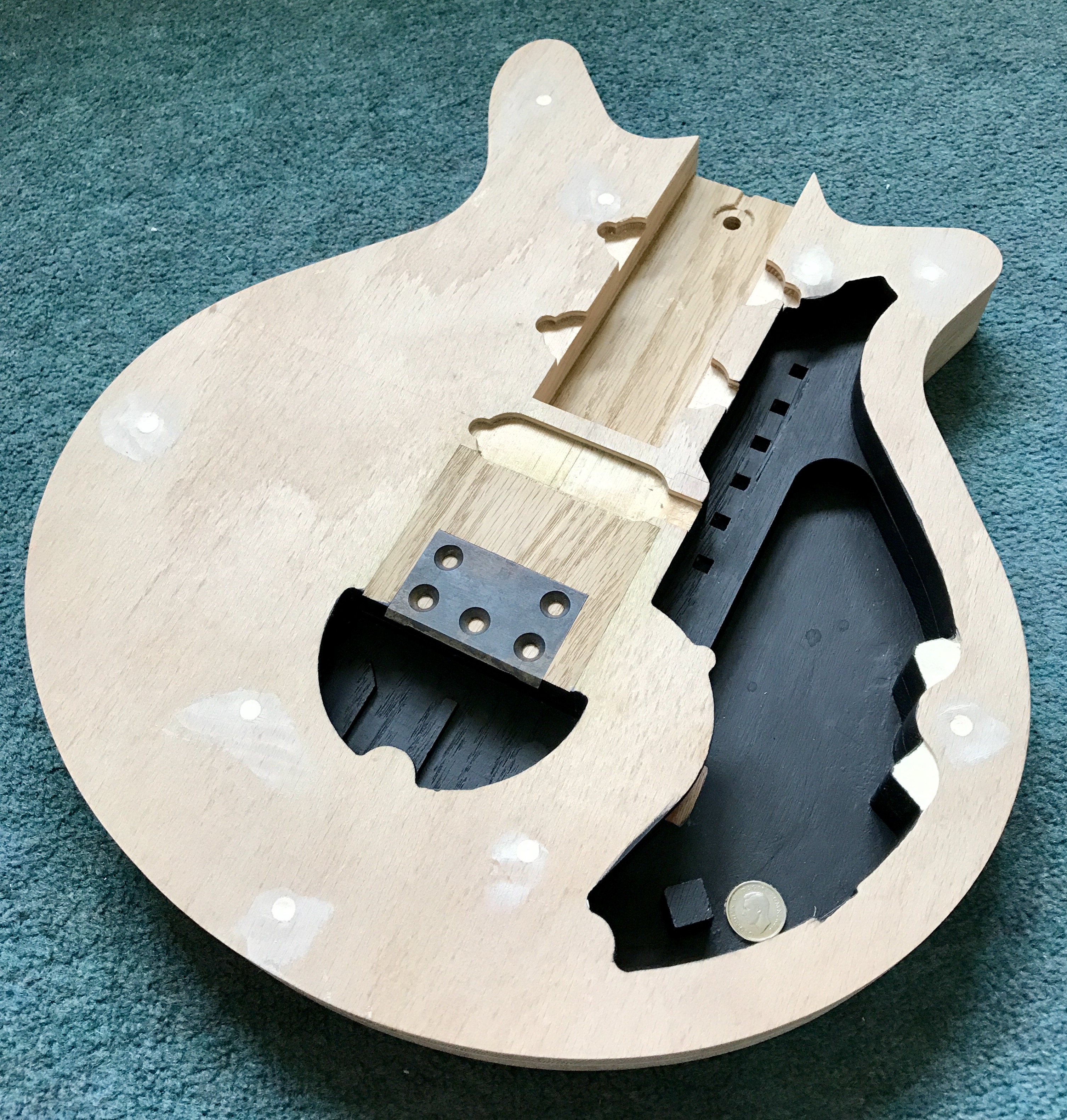 When the body section alignment jig was ready, I inserted the final body upper section and screwed through the upper section of the test body to mark out the positions of the holes for the body fixing screws. I then fitted the final body upper and lower sections and drilled and countersunk pilot holes for the body fixing screws. Then I painted the exposed cavities with Rustins Blackboard Paint, glued the body sections together and glued in the small oak insert with tremolo bolt retaining bar with wood glue. I filled in the remaining screw head countersink with wood filler and abraded it flush with the wood.