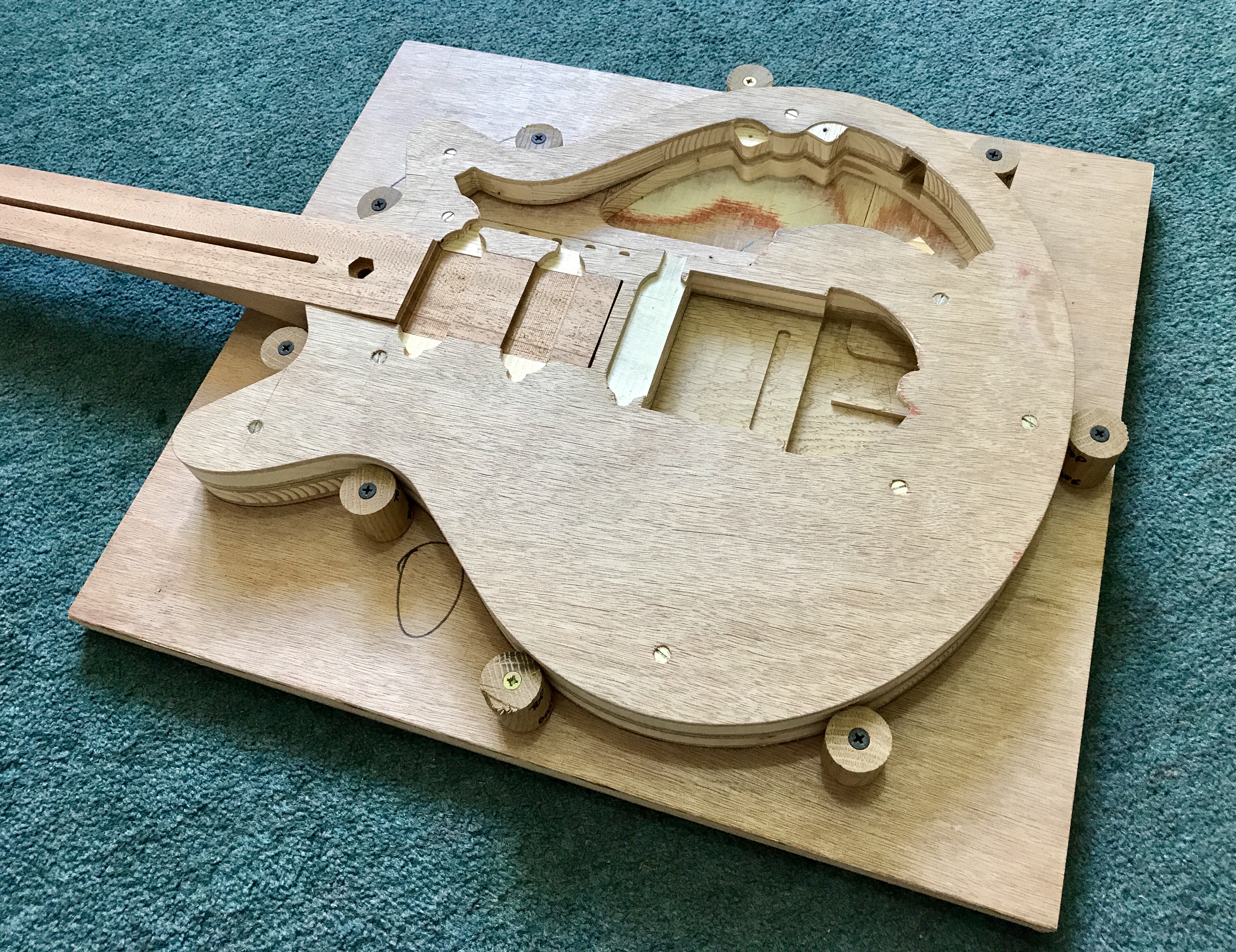 After cutting the body sections I began assembling the body for my Brian May Red Special replica guitar. To facilitate this I made a body section alignment jig by re-purposing a piece of slightly warped blockboard to form the base and lengths of oak dowel to make support pillars for the control plate.
