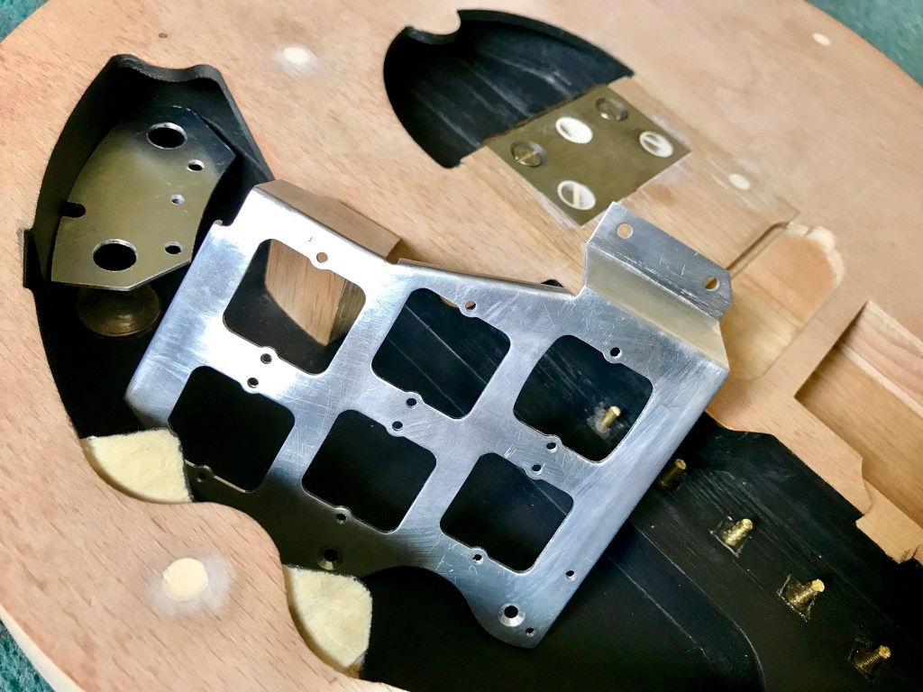 I also glued in a sixpence where the tone potentiometer body will be situated as fitted to Brian May’s original Red Special guitar. I presume that this was added by Brian to take up the space between the bottom of the tone potentiometer and the floor of the control cavity to ensure a good earth/ground connection with the control cavity shielding foil. I used a sixpence from the same year Brian was born (1947). The images in the next gallery illustrate the assembled body after this work was complete with the tremolo knife edge plate in place but not attached. I used my CNC machine to cut a control cavity overhang support pillar from oak; this cut very accurately, only requiring a fraction of a millimetre removed from the upper surface by abrading and illustrates how much time and effort CNC can save over making these parts manually.