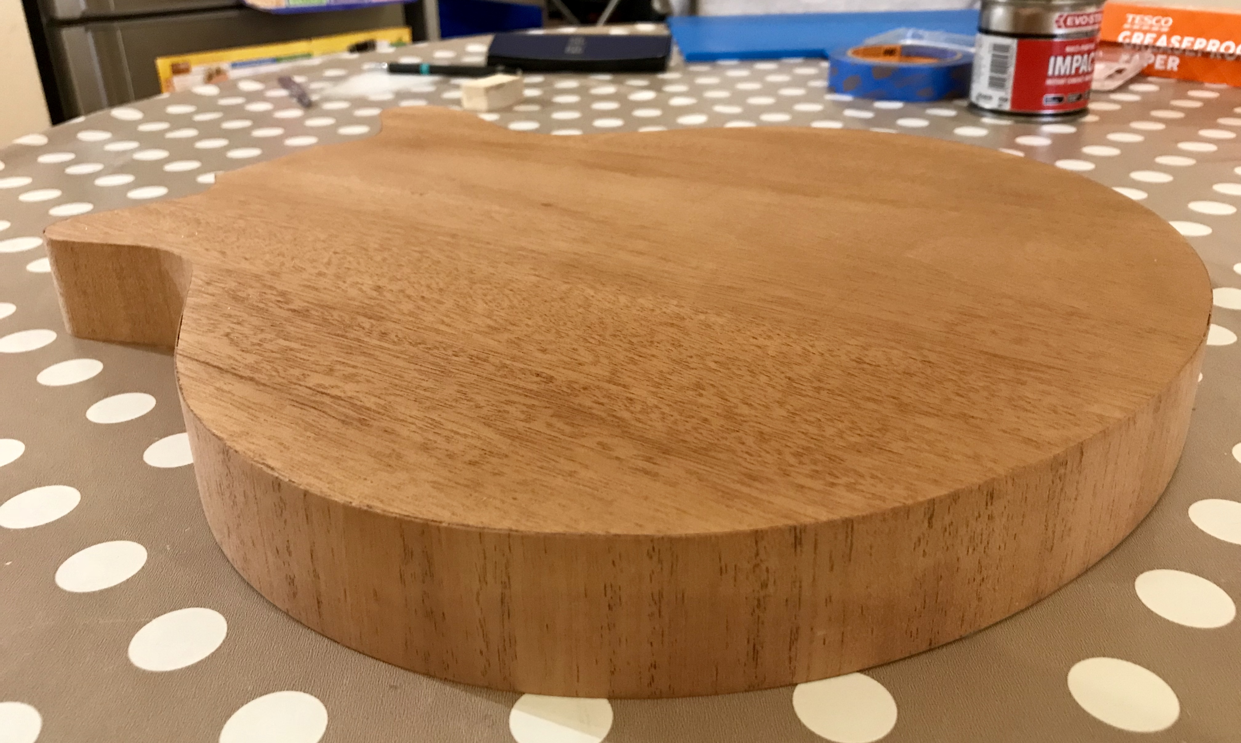 I prepared for applying the veneer to the side of the final guitar body by again practicing on the rough/test body. This went very well with good adhesion and neat joins. I used a contact adhesive (Evo Stik Impact Adhesive). Following on from the practice effort, I veneered the side of the final guitar body using seven strips of 7 to 7 1/4” long to cover the approximately 49” length of the edge.