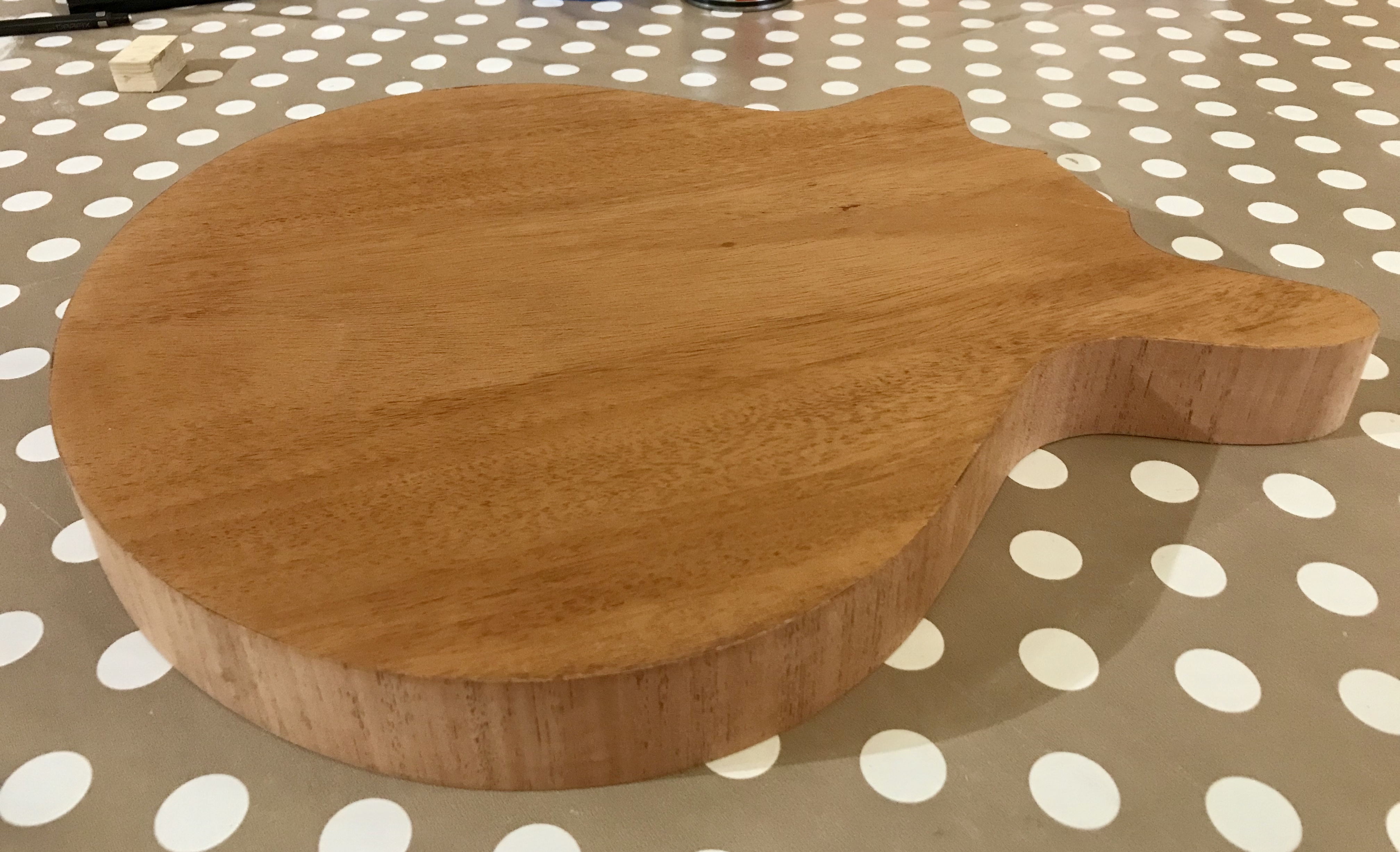 I wanted to use thin (3/128″, 0.6 mm) knife cut marquetry veneer to finish the guitar body as Brian May did. However, I found it difficult to obtain quarter cut mahogany veneer sheet in sufficient width to cover the guitar body with some overlap to allow for shrinkage and trimming. Therefore I had to take my chances with crown cut veneer and hope that I could find some with sections of quasi linear grain. I do not find cathedral type features in the veneer aesthetically appealing. I also do not find finishes with highly uniform, linear grain or obvious stripes/banding as displayed in sapele veneer appealing either. The former look too ‘perfect’ to me and neither are really representative of the original Brian May Red Special.