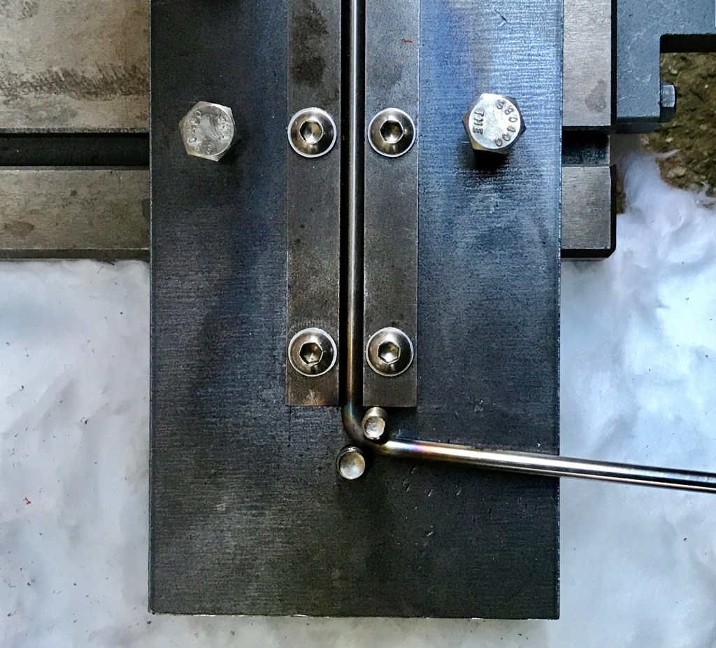 To replicate the design of the original Red Special guitar, I made a custom bending jig made from a section of mild steel plate and two 5″ lengths of mild steel ground flat stock secured with 6 mm diameter thread flanged hex head machine screws.