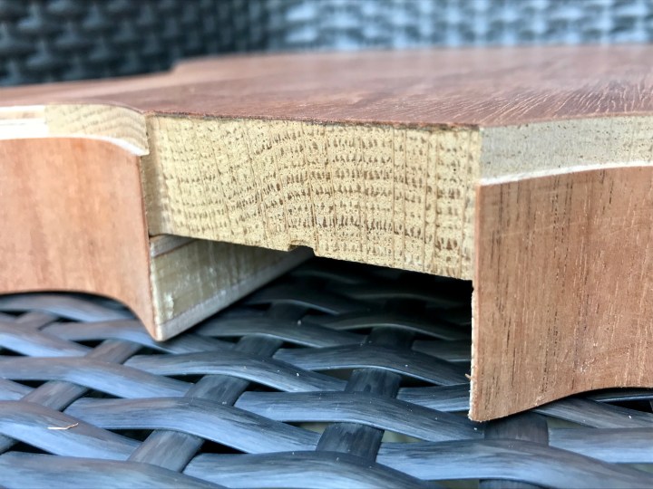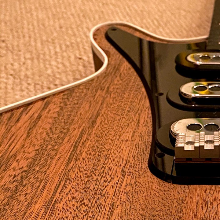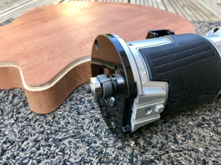 I used the same method as with my 3/4 scale Brian May Red Special build (which was a solid mahogany body). This involved a Makita RT0700CX4 laminate trimmer/mini router and the StewMac bearing guided tungsten carbide router bit. With due care and attention (e.g. holding down the router base with two fingers onto the surface), a low router speed (setting 2 on the Makita) and working in a clockwise direction around the guitar in the same direction of rotation that the router bit is turning, the results were near perfect with no veneer tear out whatsoever evident and no frictional burning of the timber.